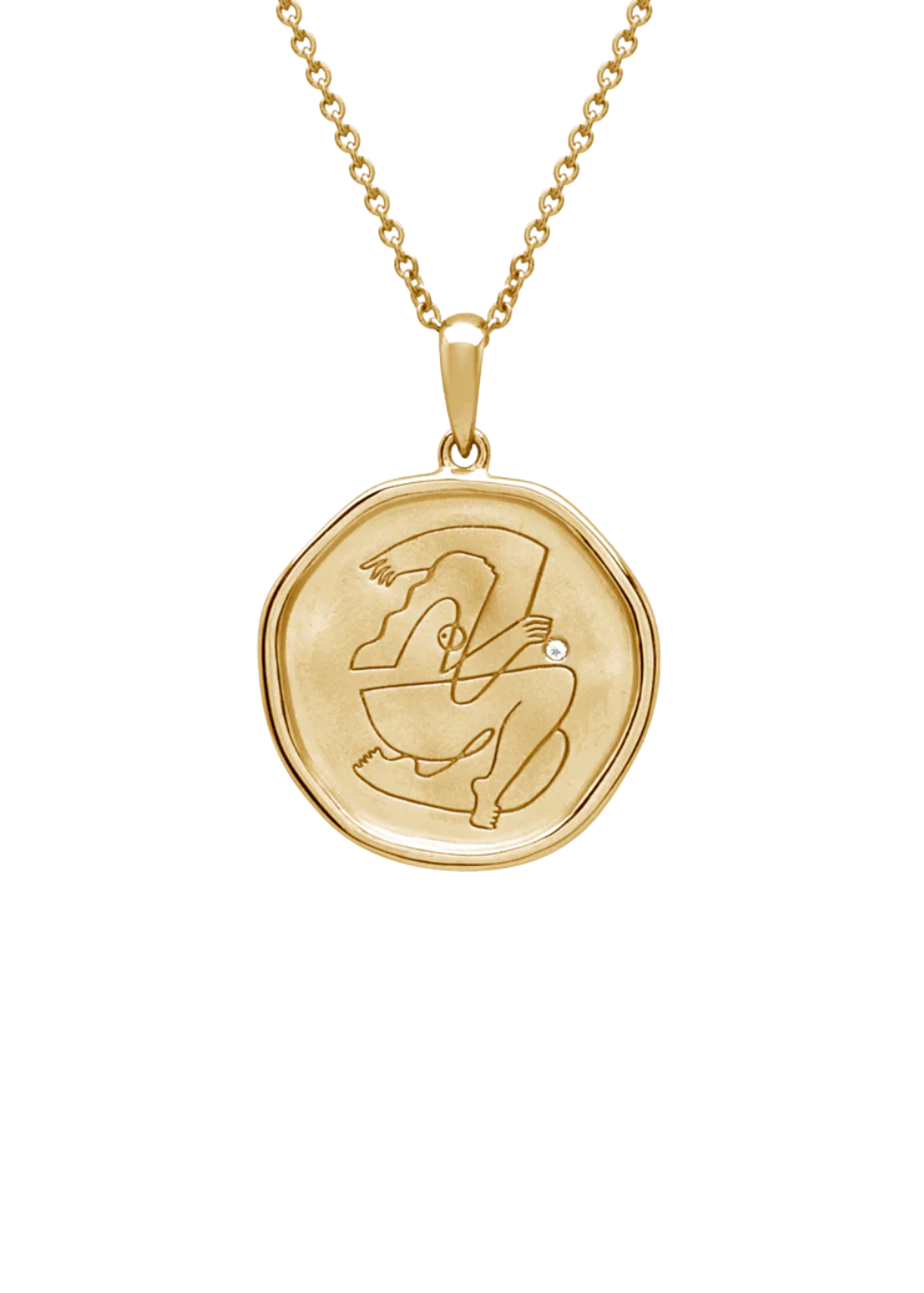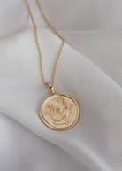 Yellow Gold Coin Necklace with etched Empowerment drawing on pendant, featuring White Topaz.