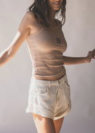Introducing our Goldie Denim Short in Cream. Crafted from our soft cotton denim in a fresh cream colour, perfect for the warmer days. Featuring an exaggerated rolled hem, flattering loose leg shape, feature button and our vegan leather patch at the back. Wears yours with our Marina Tee and your favourite sandals for a relaxed and chic look.