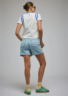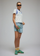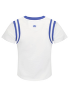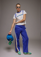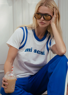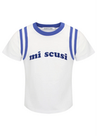 Our Mi Scusi Baby Tee in Warm White is your must-have piece. Cut in our new slim fitting shape, this style is made from luxurious soft 100% cotton. Featuring a playful "mi scusi" velvet applique print on the front, and velvet trims on sleeves. Pair back effortlessly with our Vici Trackpant Ultramarine and your favourite sneakers.