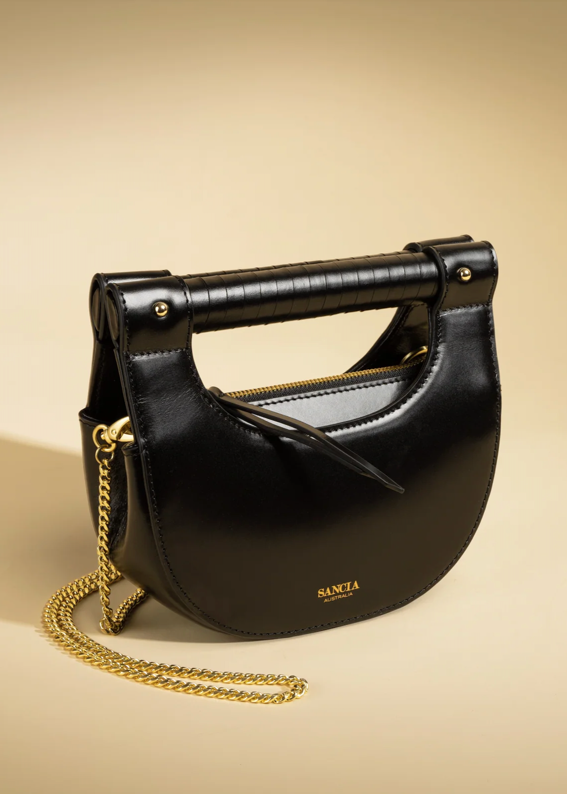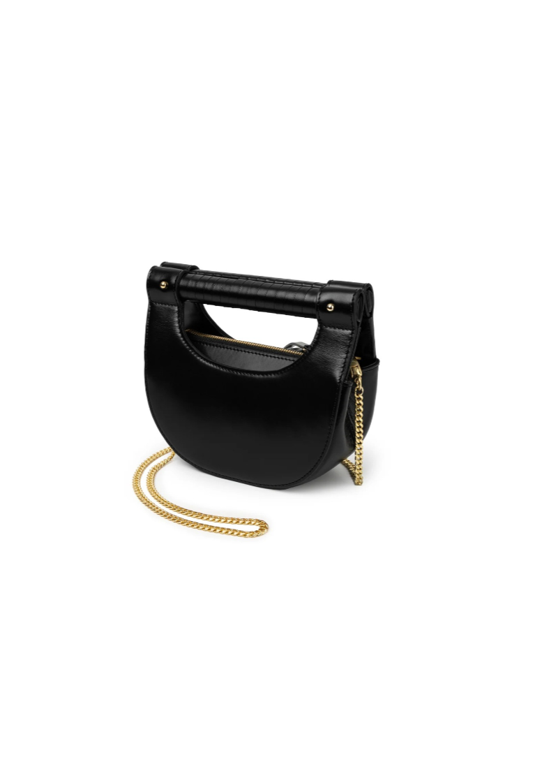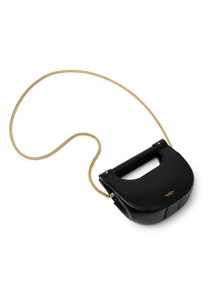 The perfect occasion bag, the Cybil features SANCIA’s signature leather-wrapped handle with a crescent shaped body. Made in sumptuous full-grain leather, the two sides of the handlebar pull apart to access the inside. The bag has a hard structure and features a long gold chain shoulder strap option
