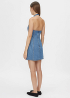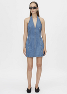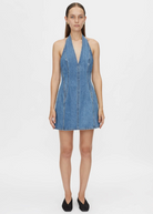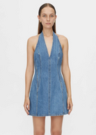 The Cascadia Denim Mini Dress is crafted from a cotton-blend fabric in a fitted, halter-style mini dress silhouette. This dress features a V-neck and centre back zip closure