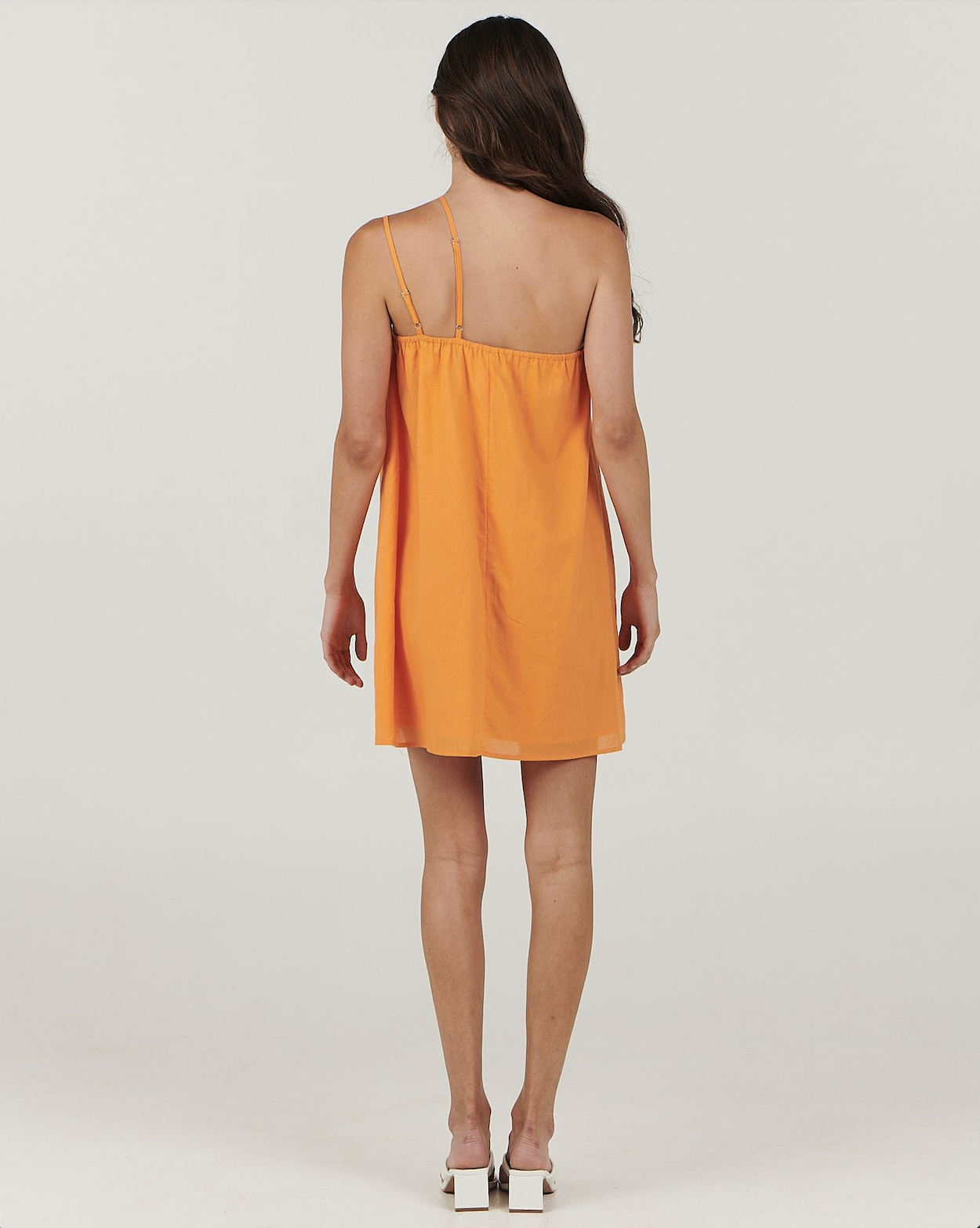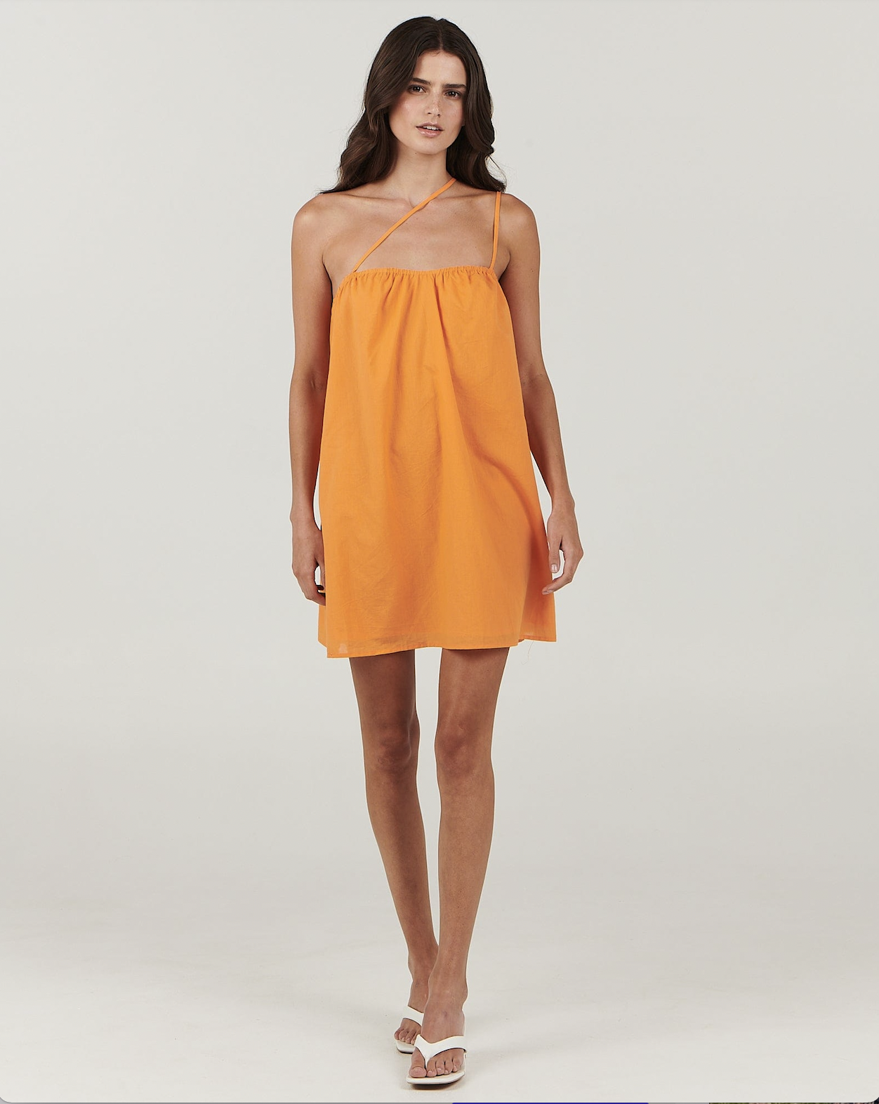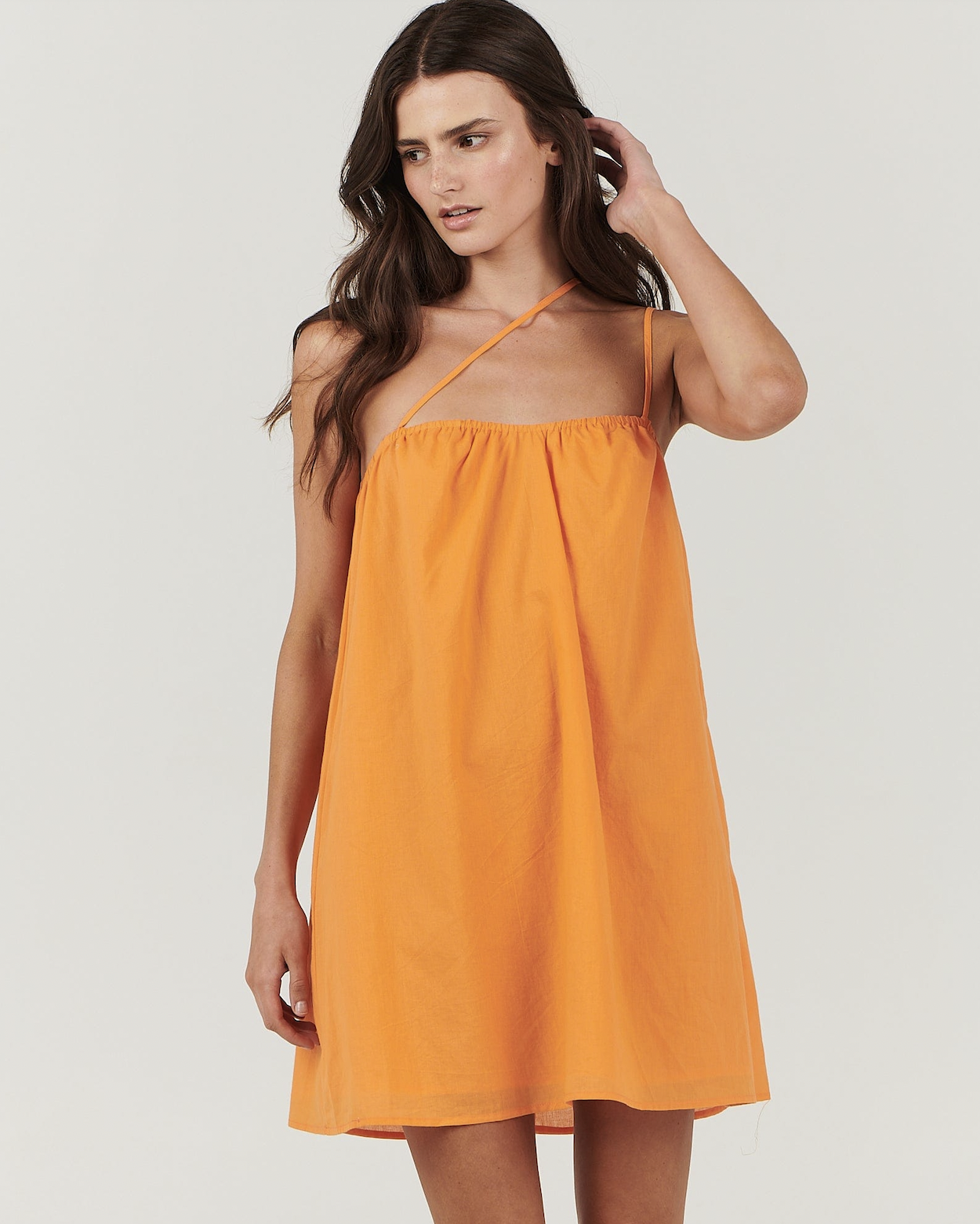 With asymmetric straps and a vibrant sunset hue, this mini sundress is always resort ready. Wear it with an oversize tote while browsing the markets or throw it on over your bikini for a beachside stroll.