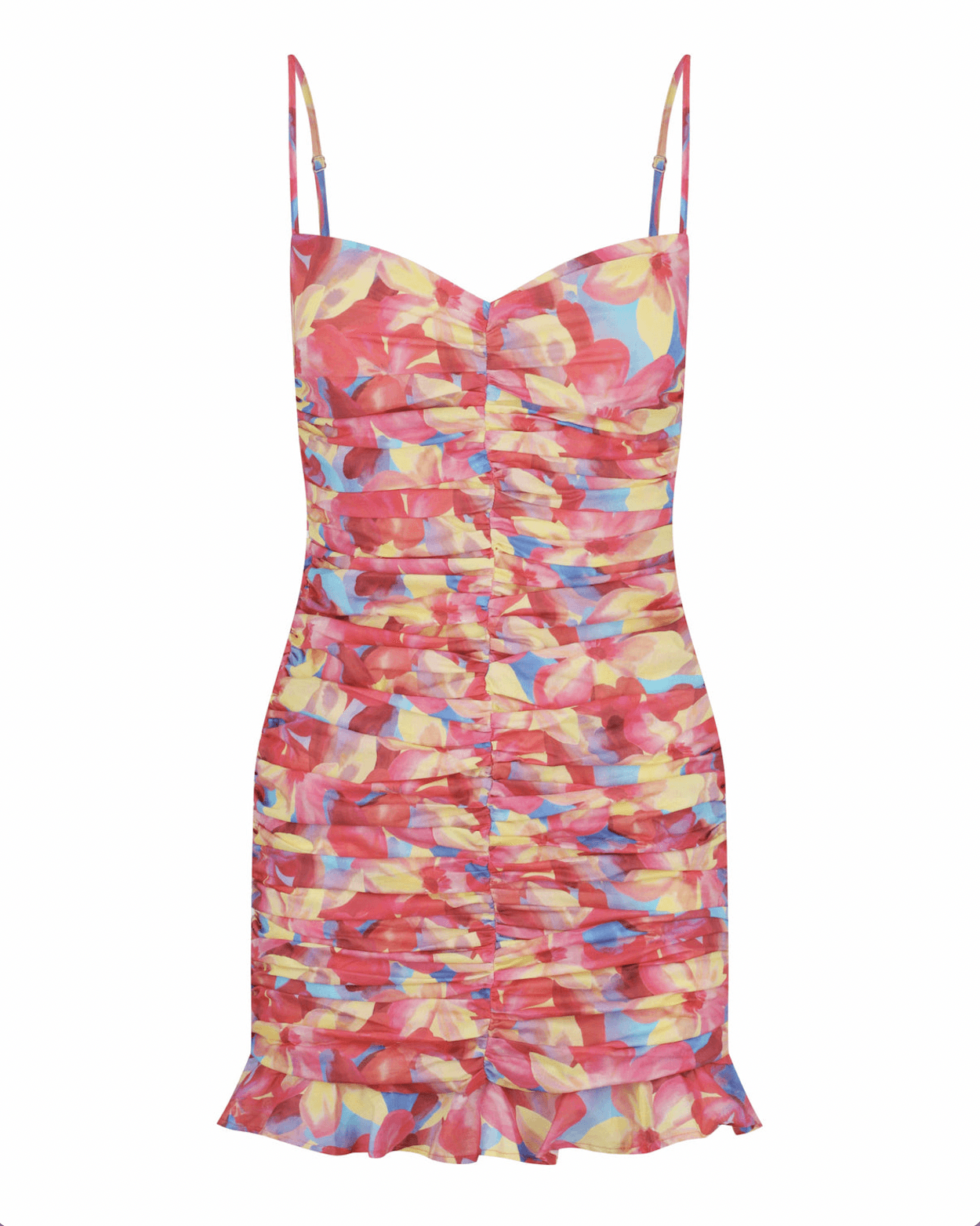 With a sweetheart neckline and spaghetti straps, this form-fitting floral mini dress is a lovely option for day or night. Ruched throughout for texture and interest, and finished with a hemline frill, it’s super cute with strappy heels for effortless elegance.