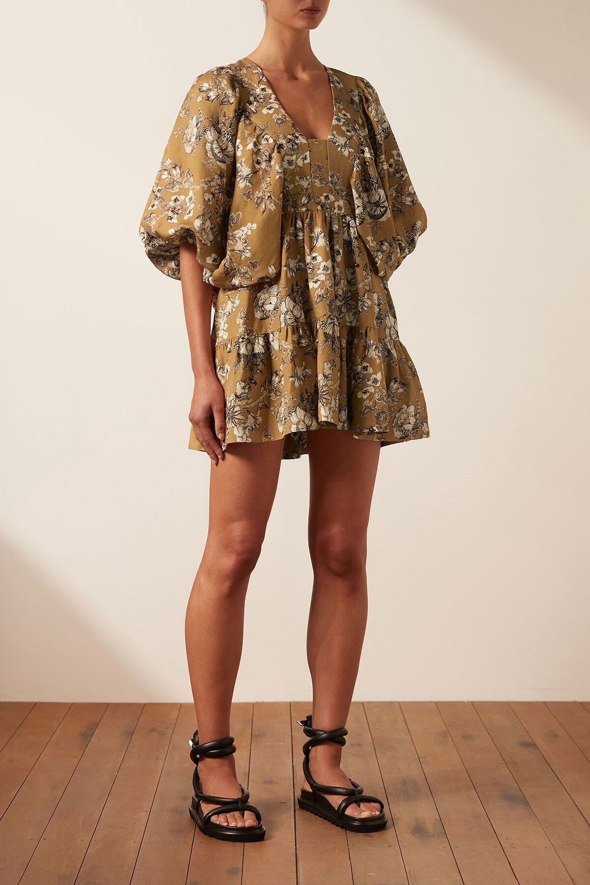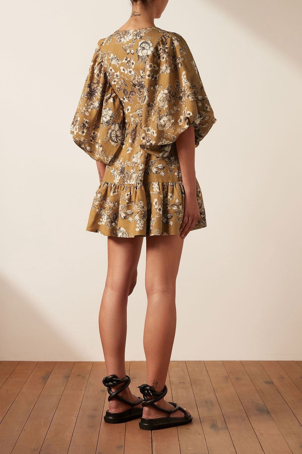 SHONA JOY Cecilia Plunged Balloon Sleeve Mini Dress - Ochre/Multi