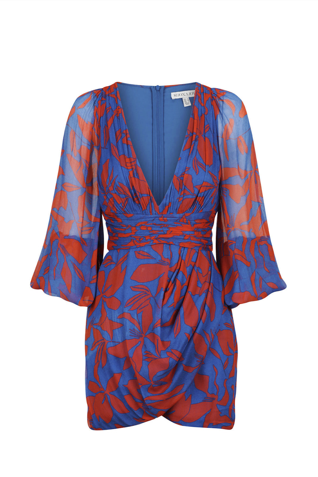 SHONA JOY Flore Plunged Ruched Waist Mini Dress - Blue/Sailor Red