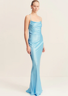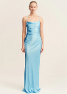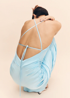 Lace back maxi dress in iceberg blue in a LENZING™ ECOVERO™ with luxurious satin finish.