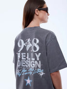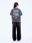 The Aurora Tee blends cotton and recycled cotton in a boxy, drop-shoulder silhouette with a vintage grey wash for a worn-in, band-tee mood. Finished with semi-plastisol graphics and brushed silver star studs for added attitude.