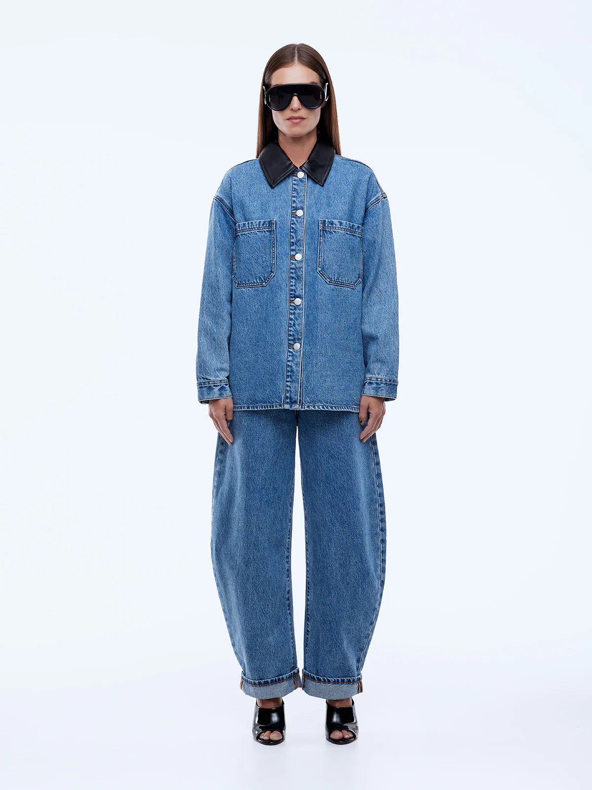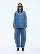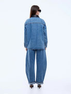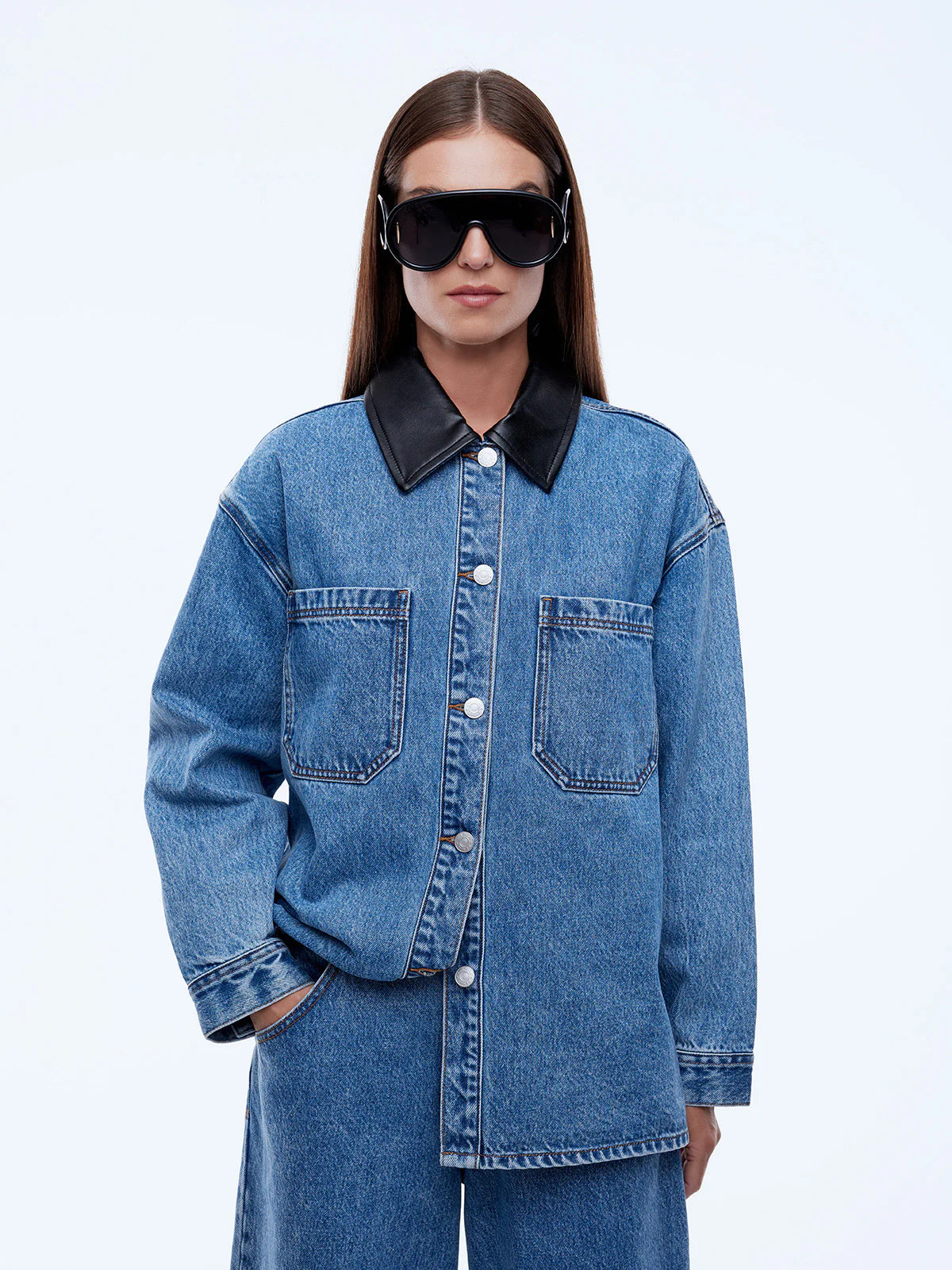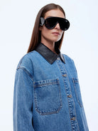The Prue Overshirt is crafted from cotton denim with an oversized, relaxed fit in mid indigo. Finished with a contrast faux leather collar and utility pockets, it's a versatile layering piece with modern attitude.