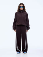 The Valentina Zip Thru is crafted in a smooth rayon blend with a relaxed, sporty silhouette, finished in cocoa for an elevated everyday layer. Designed with a two-way zip, raglan sleeves and contrast sleeve stripe detailing, it features elasticated cuffs and an adjustable hem with drawcord toggles to wear loose or cinched. Welt pockets and stacked Ena Pelly logo prints complete the confident, street ready feel.