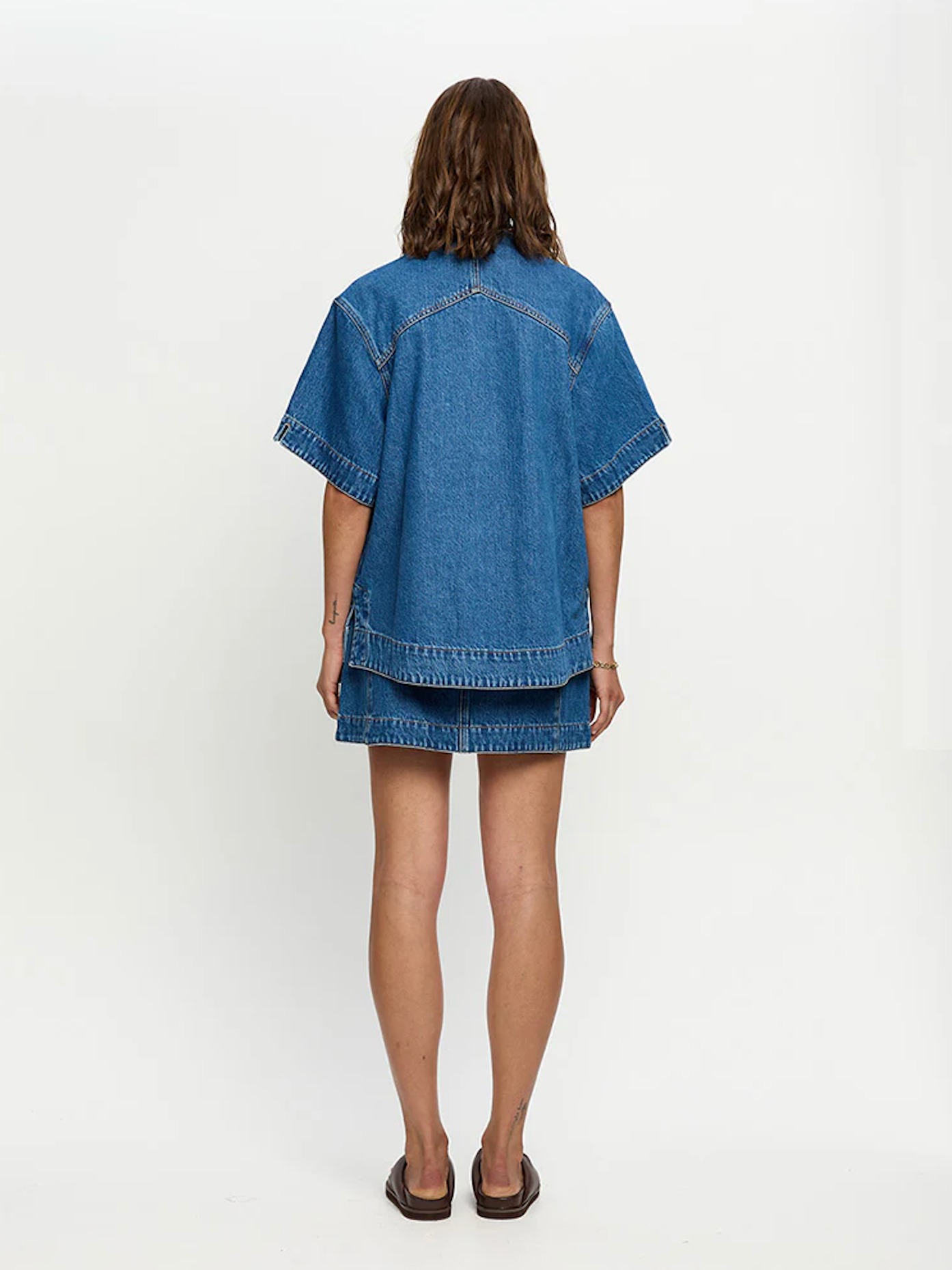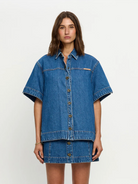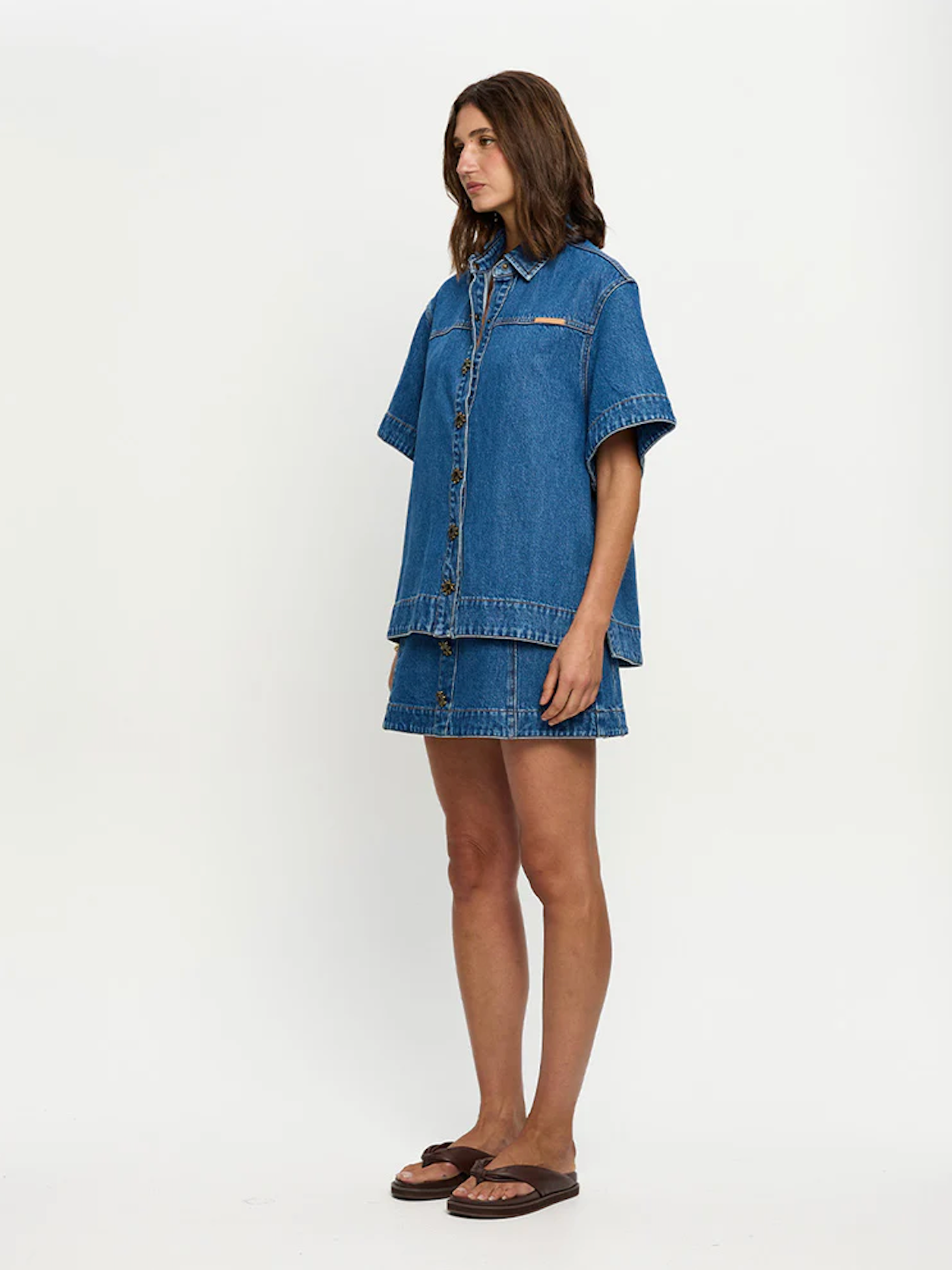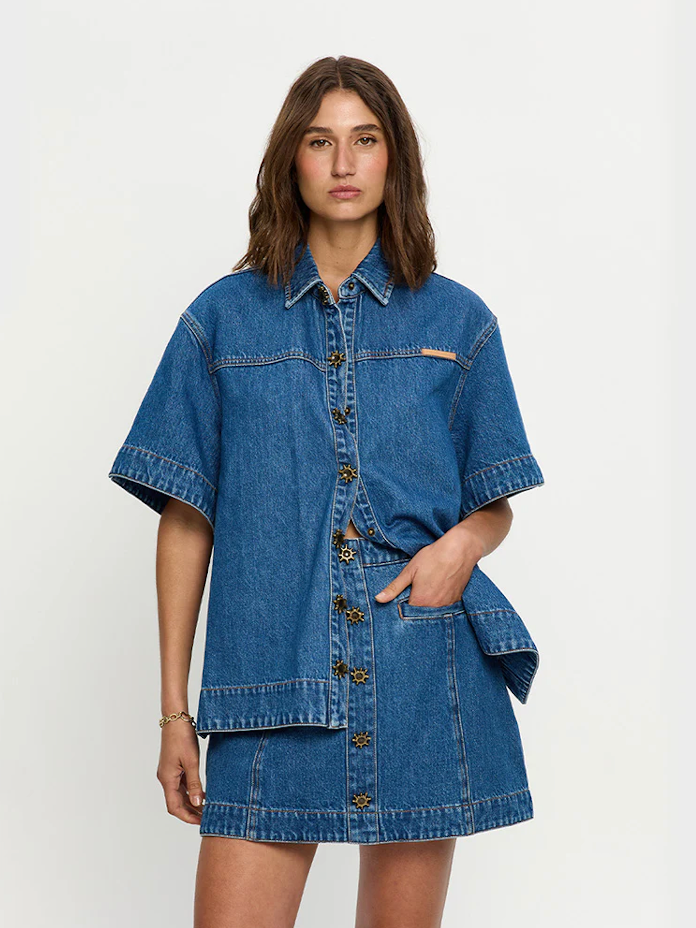 Our Signature Marla Shirt is a boxy, oversized silhouette crafted in an indigo blue denim featuring short sleeves, a button-through front and signature brass hardware. The Marla is designed to be worn on repeat, style with the Shea Denim Skirt for an effortless look.