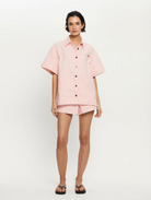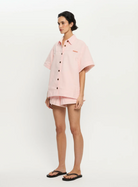 A boxy, oversized silhouette crafted in a pink denim. Our Signature Marla Shirt features a button-through front and signature brass hardware, offering a considered contrast to its relaxed form. Laid-back in shape, elevated in detail the Marla is designed to be worn on repeat, solo or styled as a set.