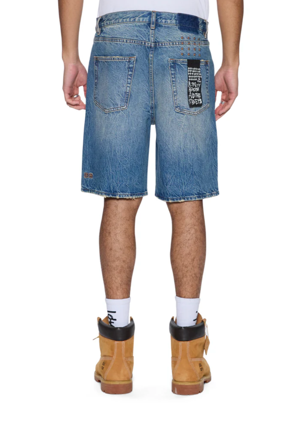 The Anti Short Texas Blue is a mid-rise relaxed short with a straight-fitting leg finishing above the knee. Made from a premium rigid denim with a heavy stone wash and marble detailing throughout, it is finished with t-box and 4x4 embroidery, ghost patching detailing, and Ksubi branded hardware