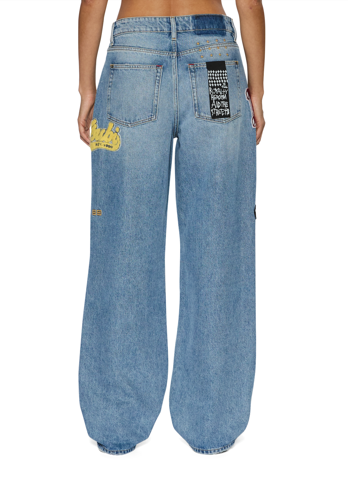 The Low Rider Horizon Patch is a low-rise relaxed straight leg jean crafted from premium European rigid denim in a mid-blue wash. It features vintage wear details, rip-and-repair patching, red contrast accents, varsity-style boucle patches, and signature Ksubi T-box, 3x4 branding and removable back pocket tag