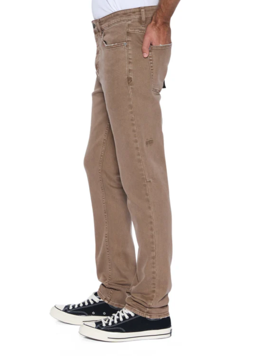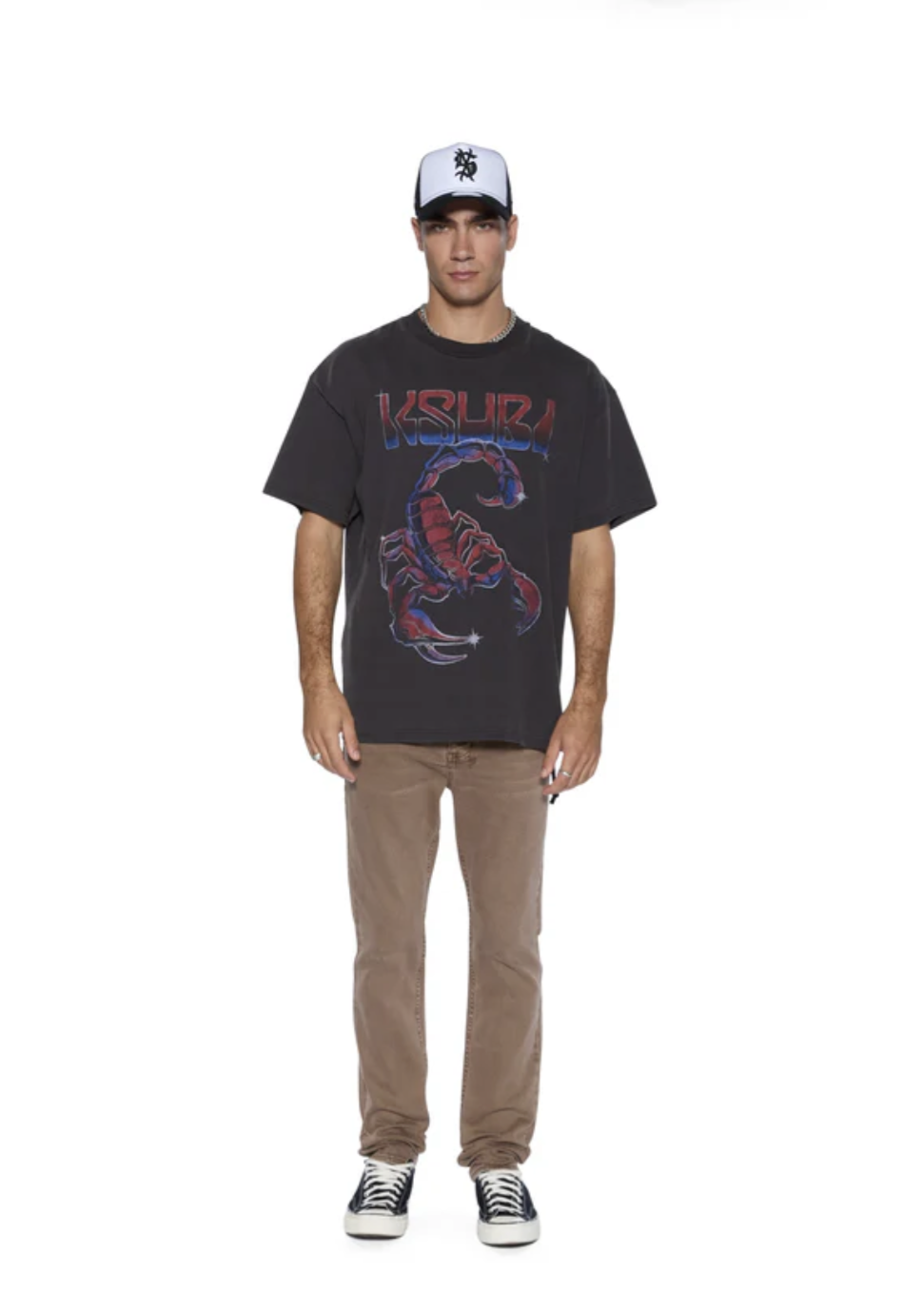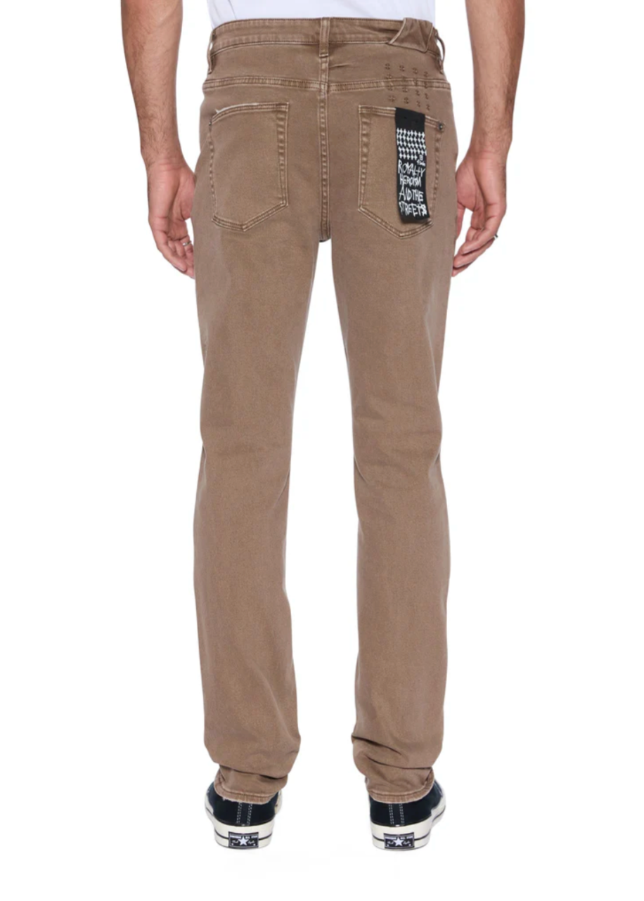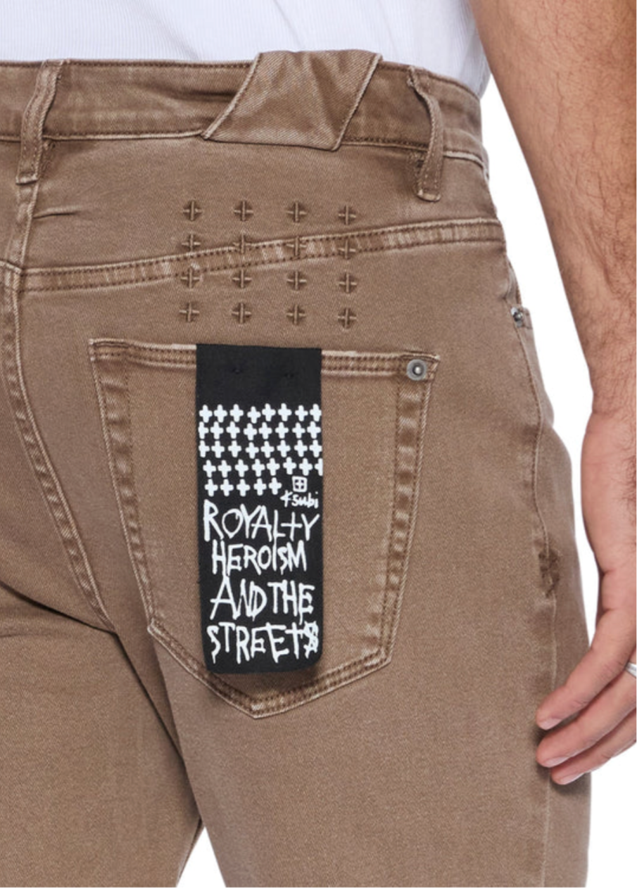 The Chitch Oak is a slim tapered jean with a mid-long rise and signature Dutch tab. Made from premium comfort stretch brown denim with an overdye and stone wash, it is finished with signature T-box and 4x4 embroidery and Ksubi branded hardware