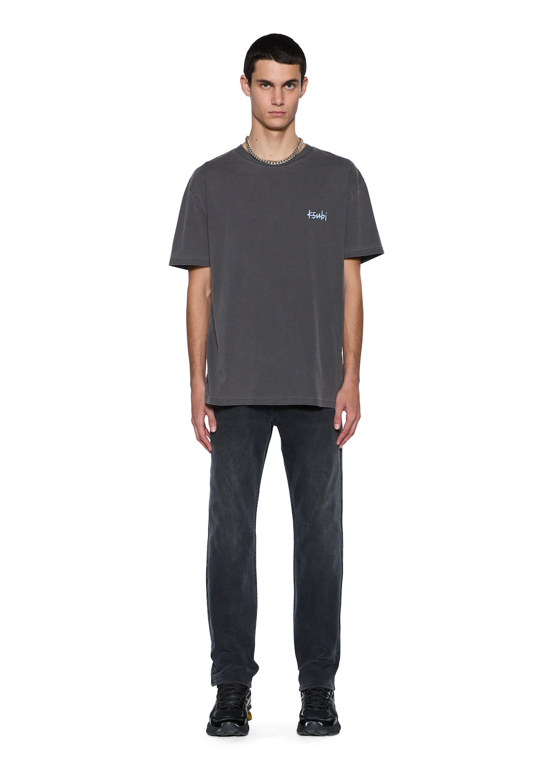 The All Day Biggie Short Sleeve Tee Charcoal is an oversized fit tee made from premium cotton jersey, garment dyed to a deep charcoal tone. Featuring Ksubi 1999 embroidery at the front crest, it's finished with a raw-cut back hem, reverse overlocked side seam, signature rats tail, and iconic T-box and 4x4 branding