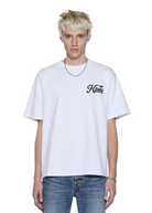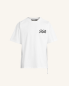 The Outfield Ekcess SS Tee White is a boxy, oversized short-sleeve t-shirt with a dropped shoulder and raw-cut back hem. Detailed with a reversed overlocked side seam, signature rats tail, and branded logos, it is made from premium heavyweight cotton jersey in white with an aged wash, featuring raised rubber artwork at the front and finished with T-box and 4x4 raised rubber branding.