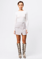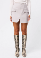 A wardrobe essential, the By Your Side Mini Skirt in Grey delivers timeless tailoring with a modern edge. This wrap mini skirt is crafted from premium suiting fabric and fully lined for a flawless fit. Featuring a sculpted silhouette with a curved hemline, front split, slanted button detailing, and jet front pockets, it offers a structured yet flattering shape. Designed for year-round wear, it pairs effortlessly with the matching By Your Side Vest for a polished set look, or with a fitted knit and tights during cooler months. Effortlessly chic, endlessly versatile, your go-to mini from desk to dinner.