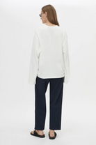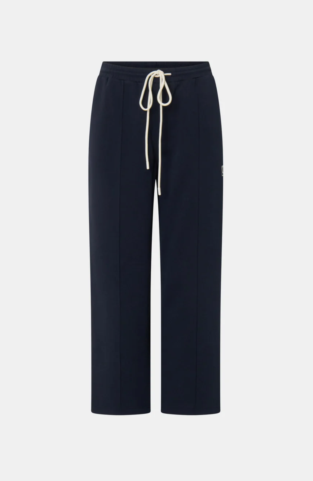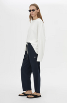 CAMILLA AND MARC Zylus straight-leg, mid-rise cropped elasticated pant in navy/white. Contrast embroidered monogram, side seam piping, centre front pintuck.