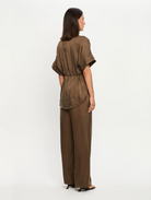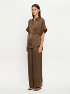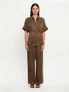The Jaxon Shirt in mocha is a relaxed fit featuring short sleeves, adjustable drawcords at waist, complete with a concealed button down front.