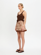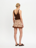 Paris is a two-toned leopard print on a soft neutral base. The Paris Mini Skirt is a fitted A-line silhouette and features an exposed back zip with signature gold hardware, complete with a contrast chocolate brown hem band.