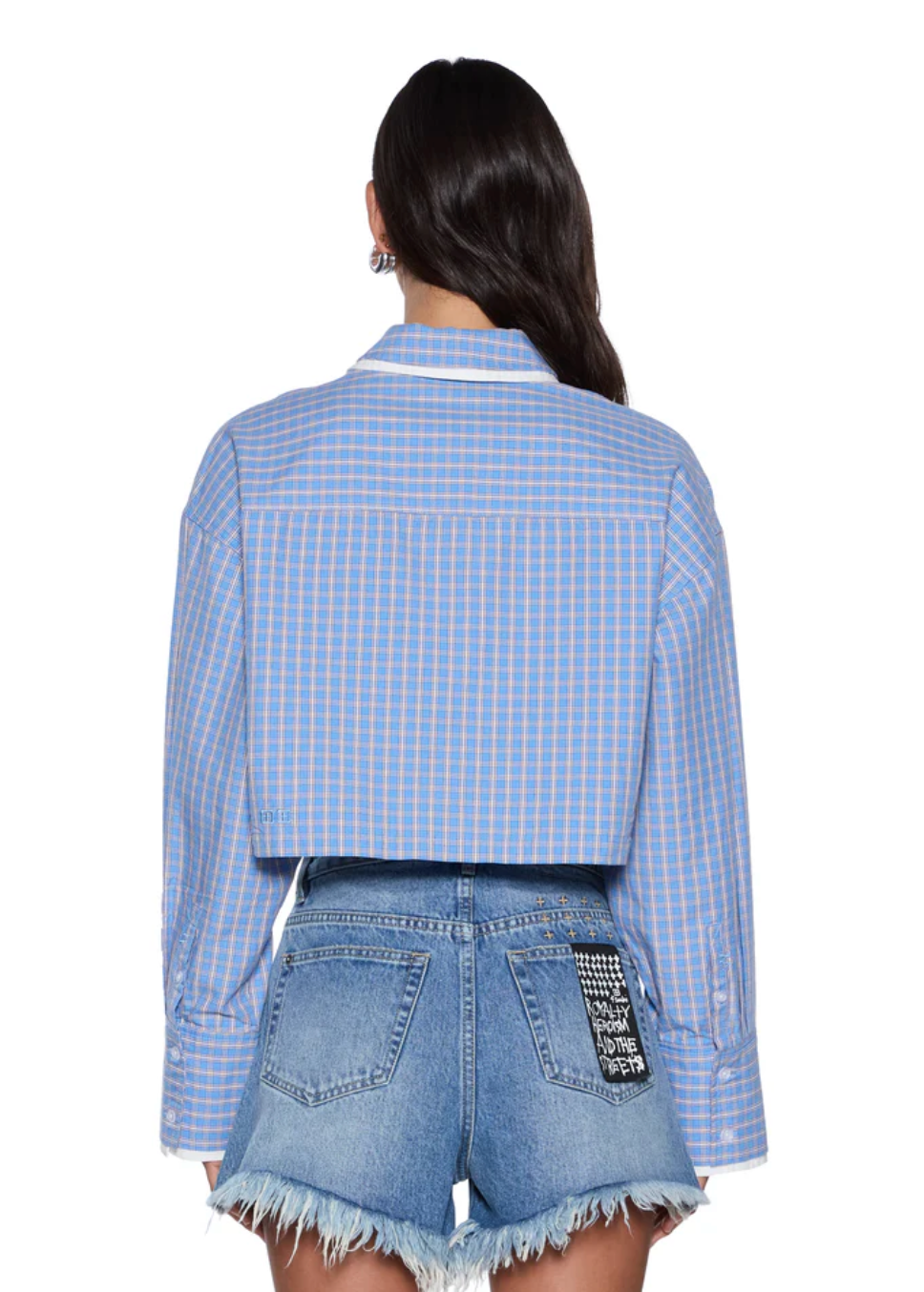 The Balter LS Shirt Blu Check is an oversized button-up shirt crafted from premium 100% cotton in a custom handloom plaid with a seasonal blue check. Designed with a cropped length, contrast double-layer collar and cuffs, panelled twin patch pockets, and exaggerated cuffs, it is finished with a 'Made in Heaven' woven label on the cuff and KsubiÕs signature T-box embroidery for an elevated off-duty look.