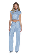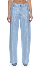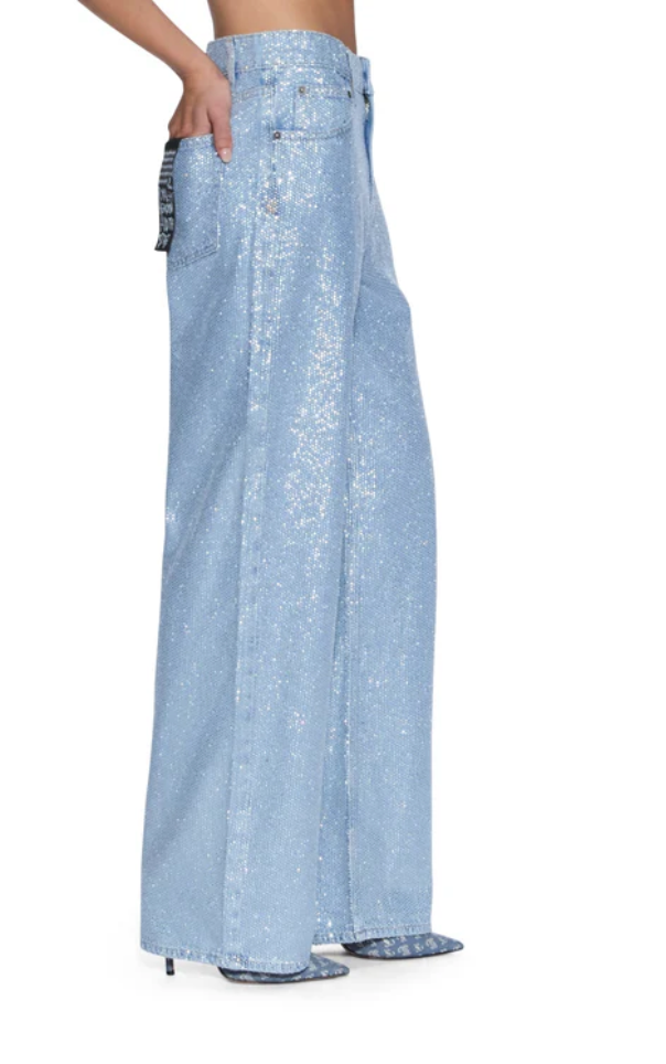 The Empire Jean High Rollers is a relaxed straight-leg, full-length jean with a true mid-rise. Made from premium European rigid denim in light blue with an enzyme-soft wash, it is densely embellished with all-over diamante hotfix crystals and features classic five-pocket styling, anti-silver branded hardware, T-box and 3x4 embroidery, and a removable pocket tag on the wearer's right back pocket.