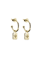 Yellow Gold Small hoop earrings with Hanging Rectangle pendant featuring White Topaz detail.