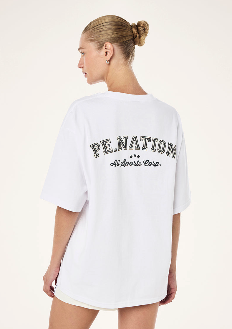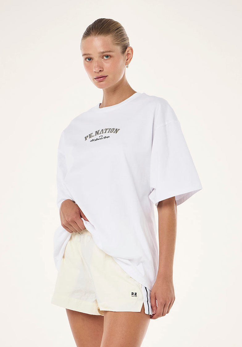 The Trial Tee in Optic White is made from our Heavy Weight Cotton Jersey fabrication. A streamlined silhouette designed to move with you throughout the day, this style offers an oversized fit, a centre front and back print and a ribbed crew neck. Pair it with tonal activewear for an effortless studio-to-street look.