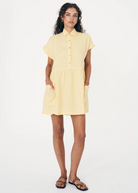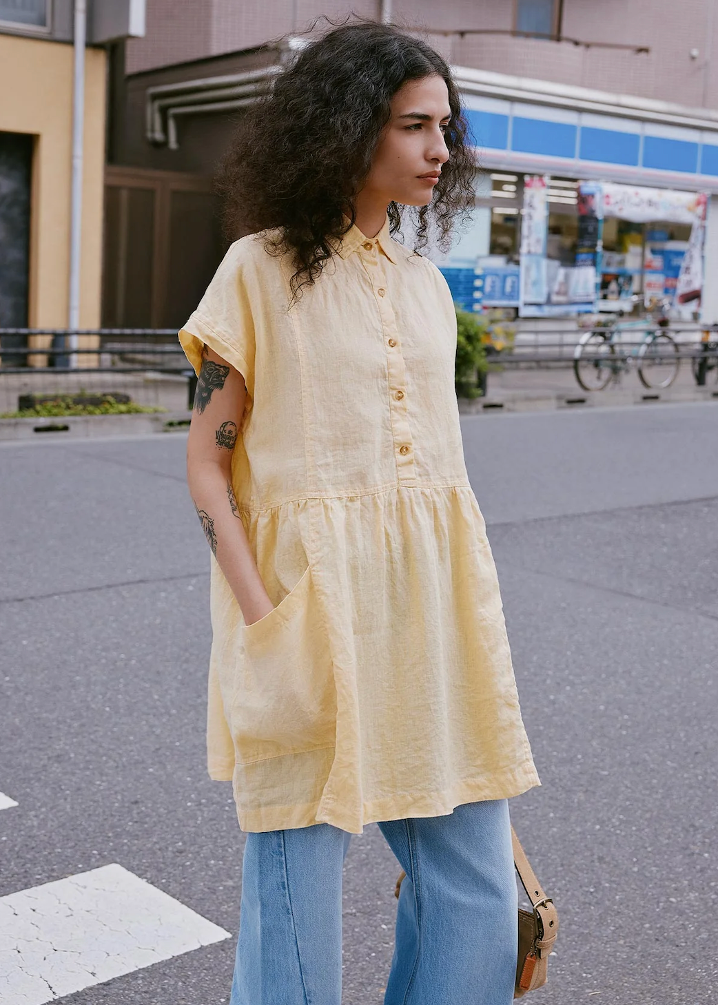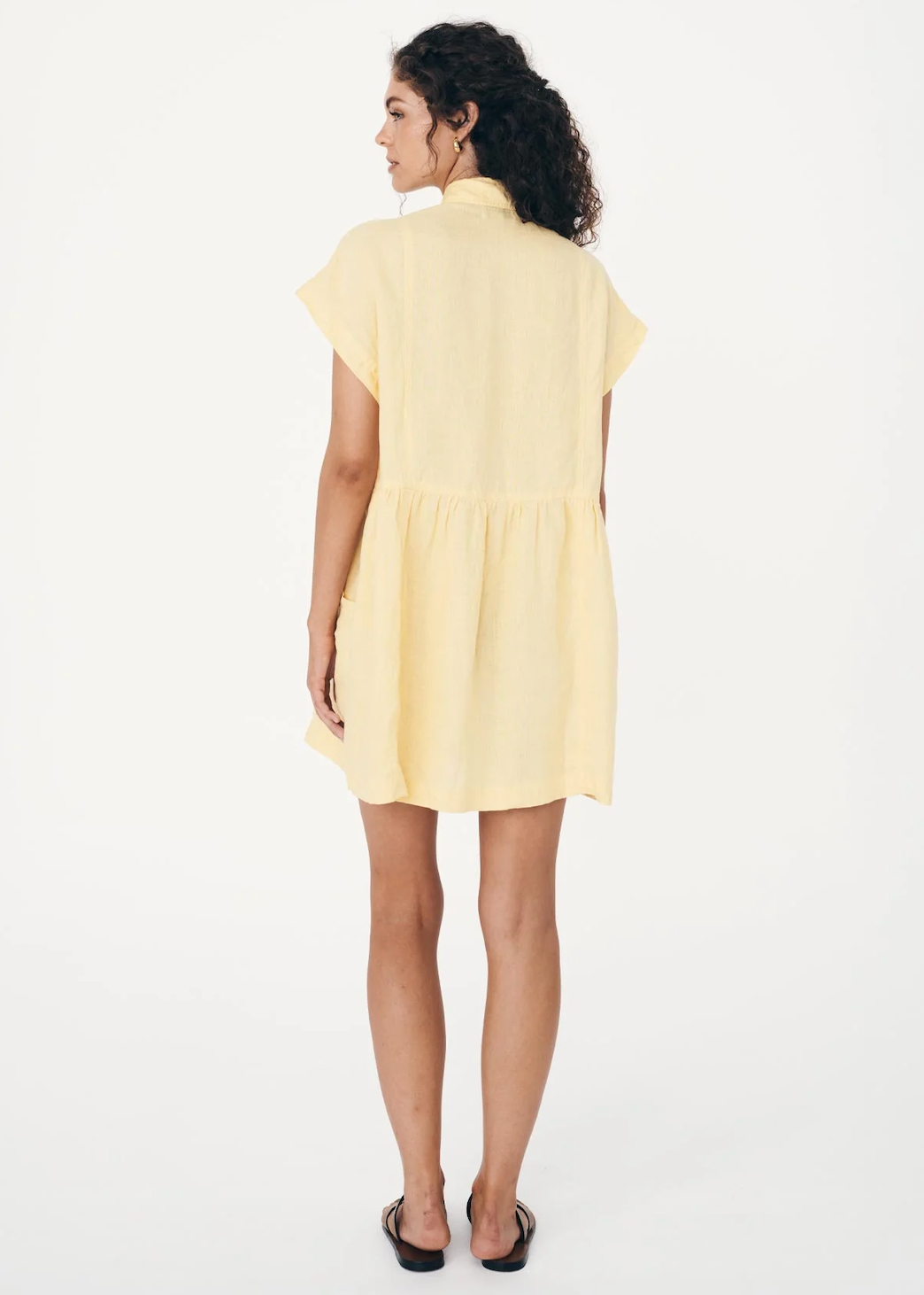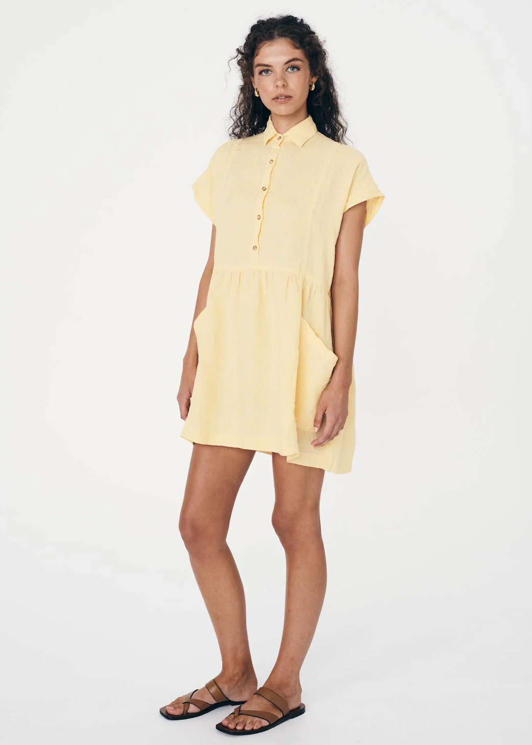 Cut from French linen in Lemon, the Gina Mini Dress balances ease and utility. A button-through style with angled patch pockets and a boxy, relaxed fit.