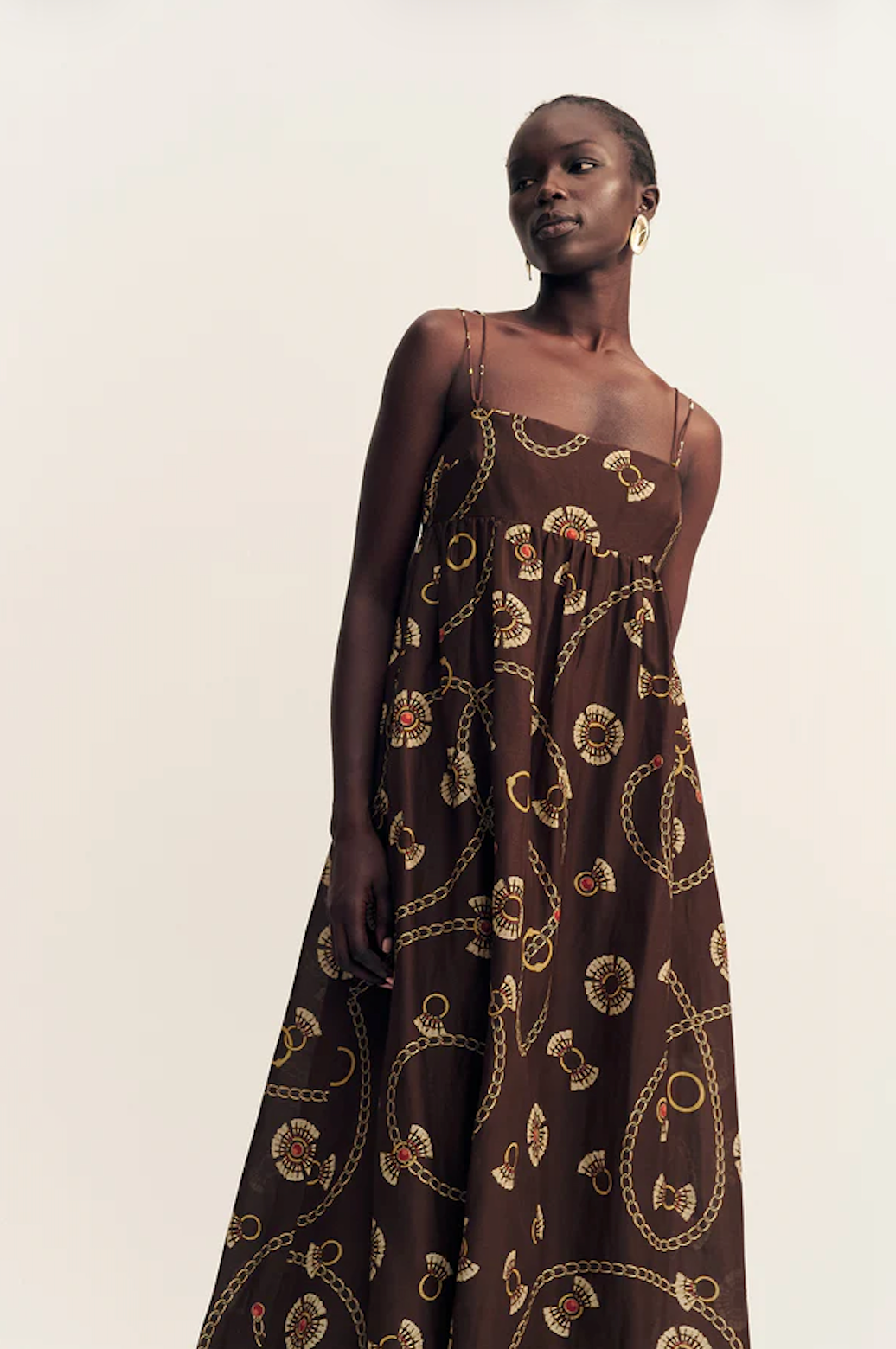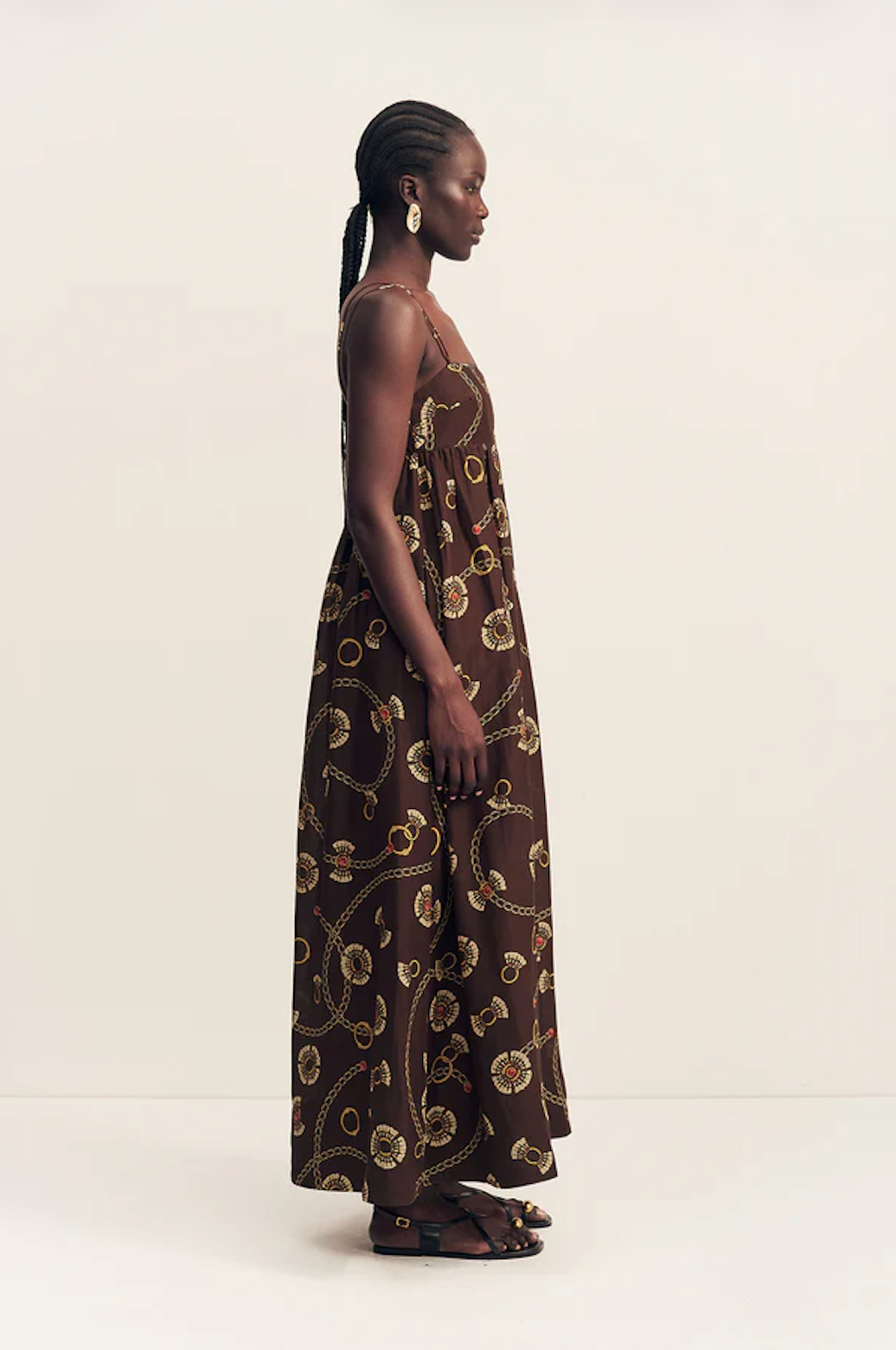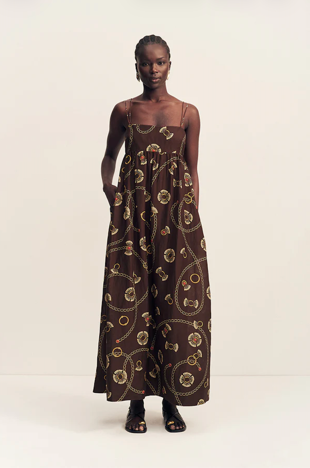 Square neck maxi dress in the medallion stamp print in a premium sheer Linen TENCEL™ blend.