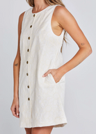 The Effortless Dress is made from embroidered cotton drill and features antique brass tacks and pockets. True to its name, it feels effortlessly cool as soon as you slip it on.