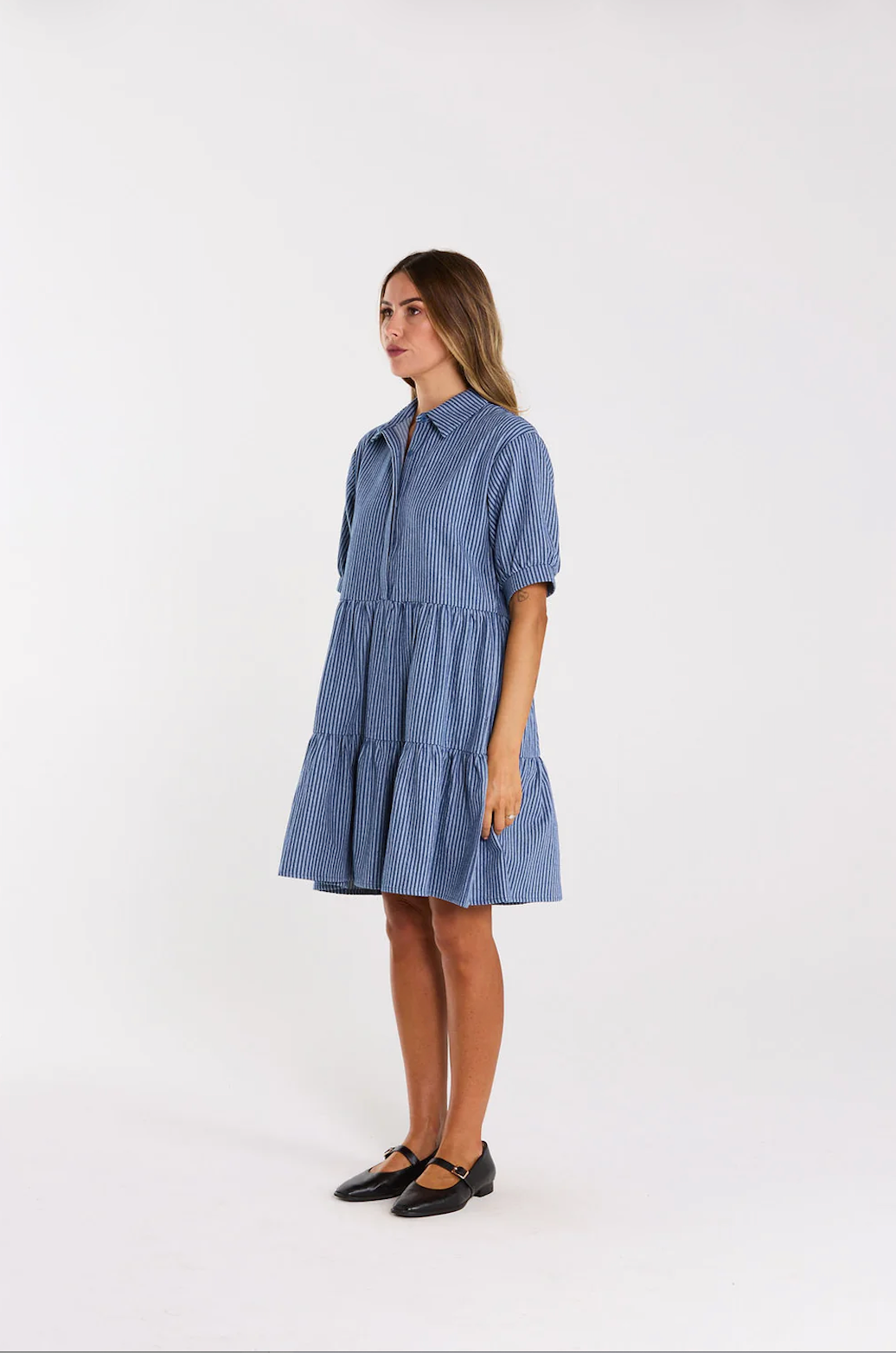 The Nova Dress is an easy-wear classic. Its regular length and concealed front placket with buttons give it a sophisticated charm. The in-seam pockets add practicality, while the gathered sleeves with cuffs offer a touch of detail.