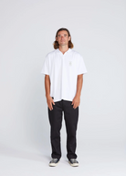 The Dojo Pant has Thing Thing tack buttons, a subtle print along the back left leg seam, and its made from sturdy cotton drill