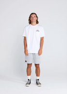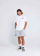 Made from striped drill fabric, it features an elasticated waistband with a drawcord and metal ends, practical pockets, and a patch badge. Easy