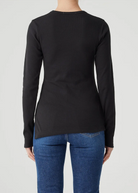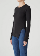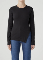 Nobody Denim's staple rib with a twist. Fitted throughout the body and sleeve with an asymmetrical hem line and side split. Crafted from organic cotton blended rib.