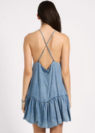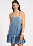 The WASHED BLUE TENCEL BUBBLE HEM MINI SLIP DRESS is an easy throw-on piece with a beachy, undone edge. Cut in soft denim-look tencel with a playful bubble hem, it’s oversized, airy, and made to move. Adjustable crossover straps at the back complete the relaxed silhouette.