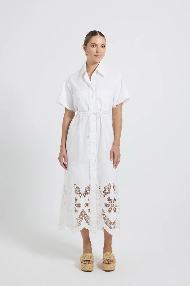 The Orla Shirt Midi by PASDUCHAS is crafted from cotton embroidery. It features a traditional angled collar, classic shirt pockets on the bodice, and short sleeves finished with scalloped trim. A thin waist tie with resin bead detail cinches the shape for a flattering fit, while a functional central button placket streamlines the silhouette. The look is completed with a scalloped hem that falls to a midi length.