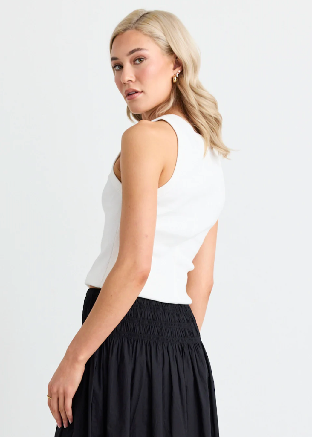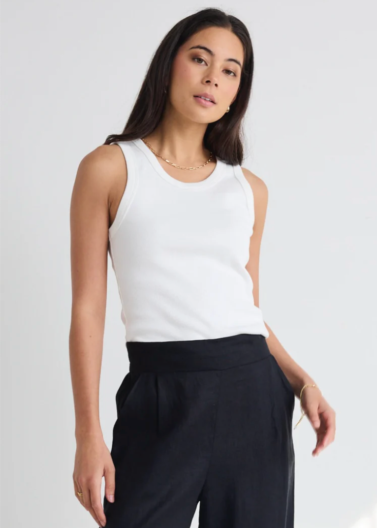 The Cobble Tank from RE:Union is a sleeveless stretchy rib knit tank that will fit snug and keep you cool all summer. Effortlessly versatile, this simple white summer tank that pairs well with a variety skirts, pants and shorts.