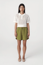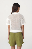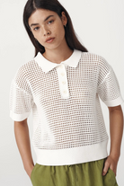 Crafted in a relaxed crochet knit, this polo-style top features a clean four-button placket with wide arm and hem bands. Light and textural, it brings a modern ease to simple seasonal layering.