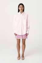 A relaxed Boyfriend-fit cotton shirt with a straight collar, curved hem and single patch pocket. Adjustable back buttons allow it to be worn loose or tied, offering a fresh, softly structured take on everyday shirting.