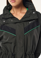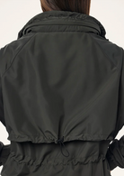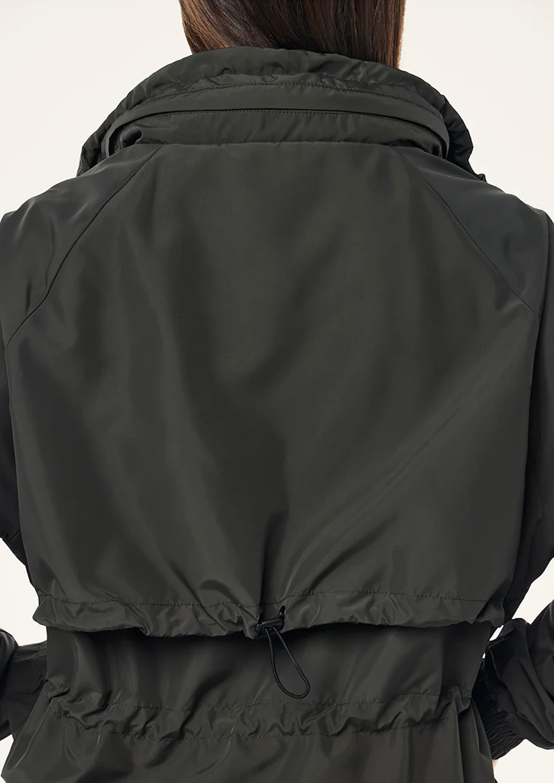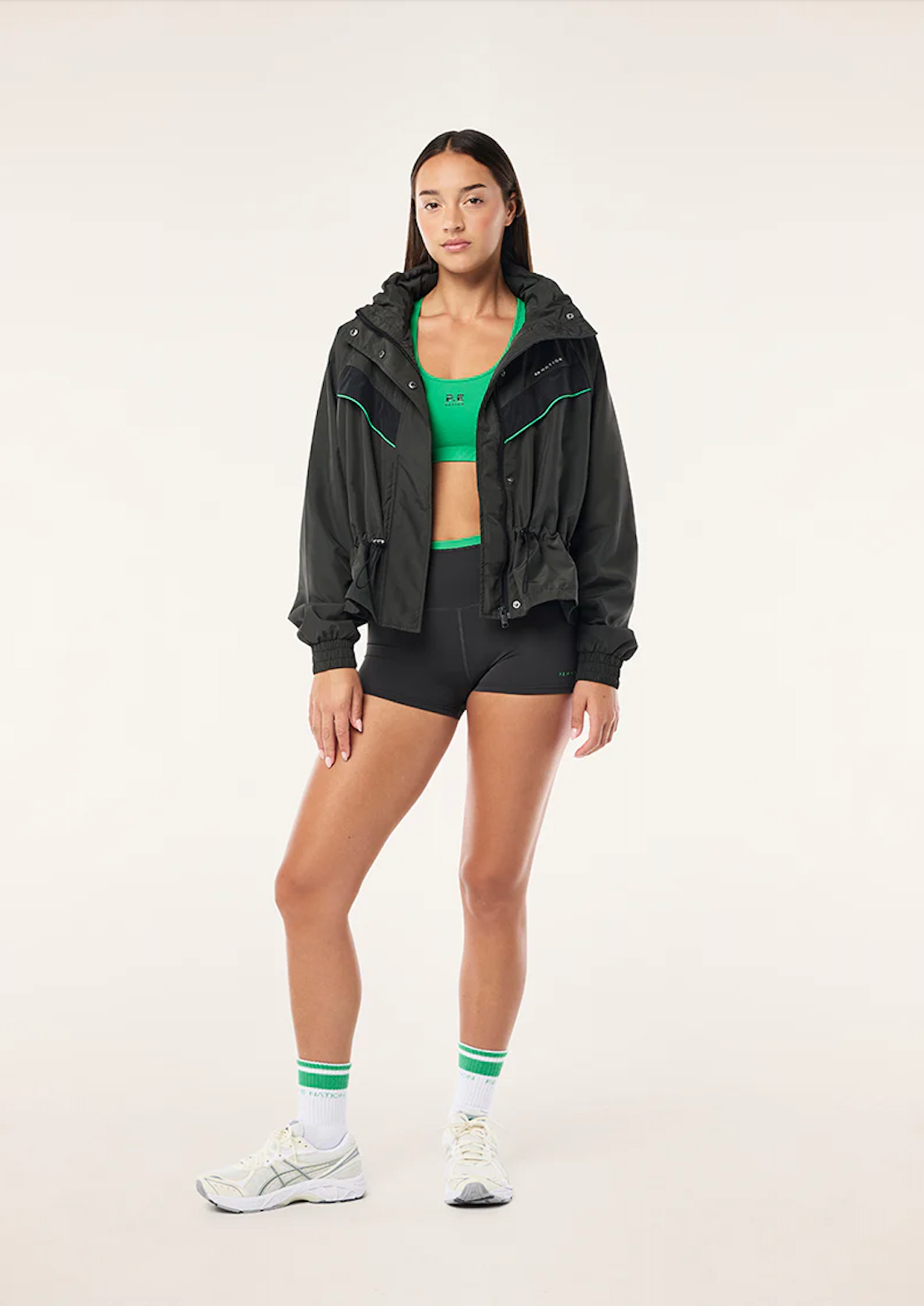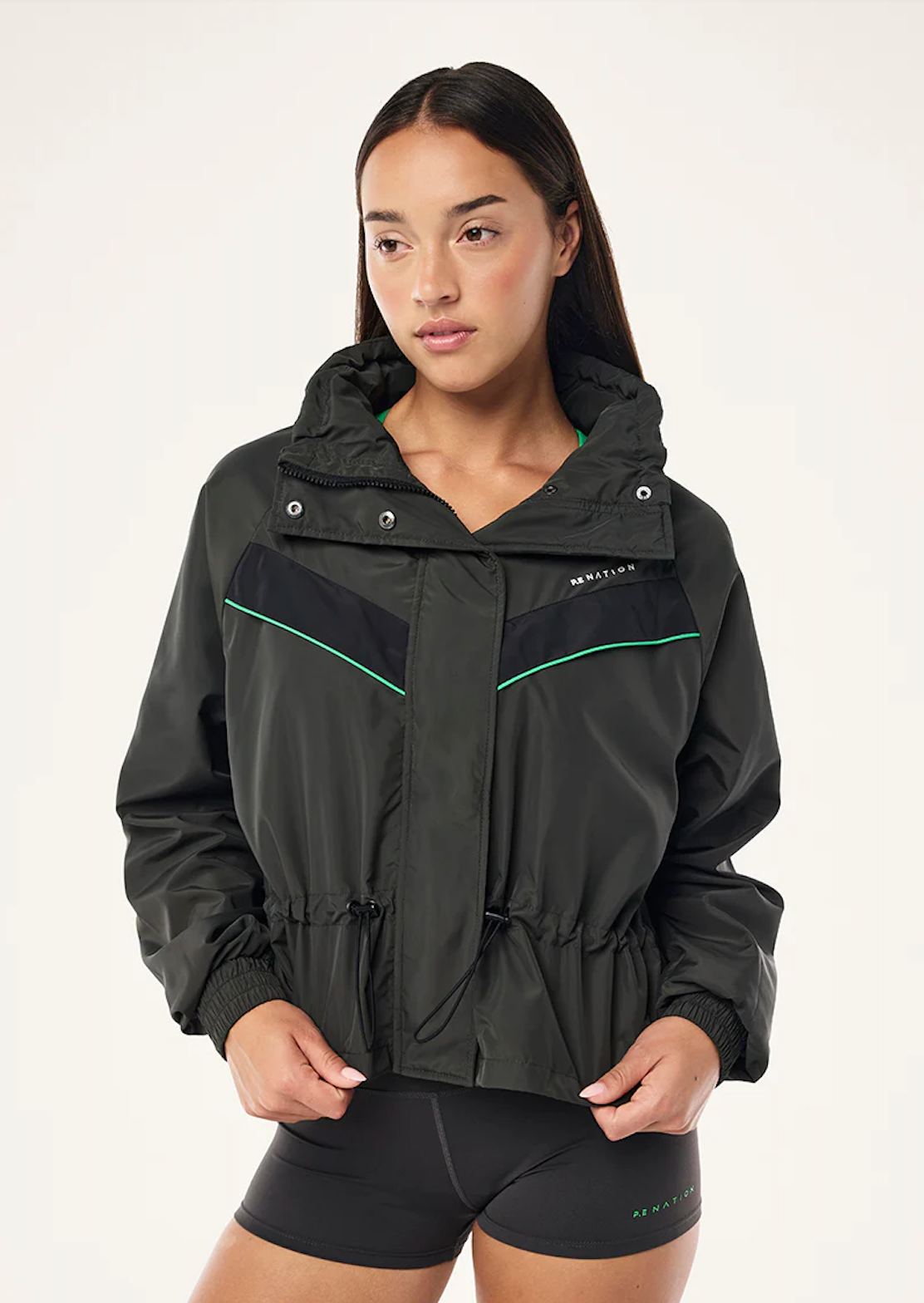 The Shelter Jacket in Caviar is designed in our signature water-resistant spray fabric, this cropped jacket features contrast chevron paneling, a hidden chest pocket, an elasticated drawcord waist, and a packable hood. Wear your jacket over activewear for an elevated athleisure look.