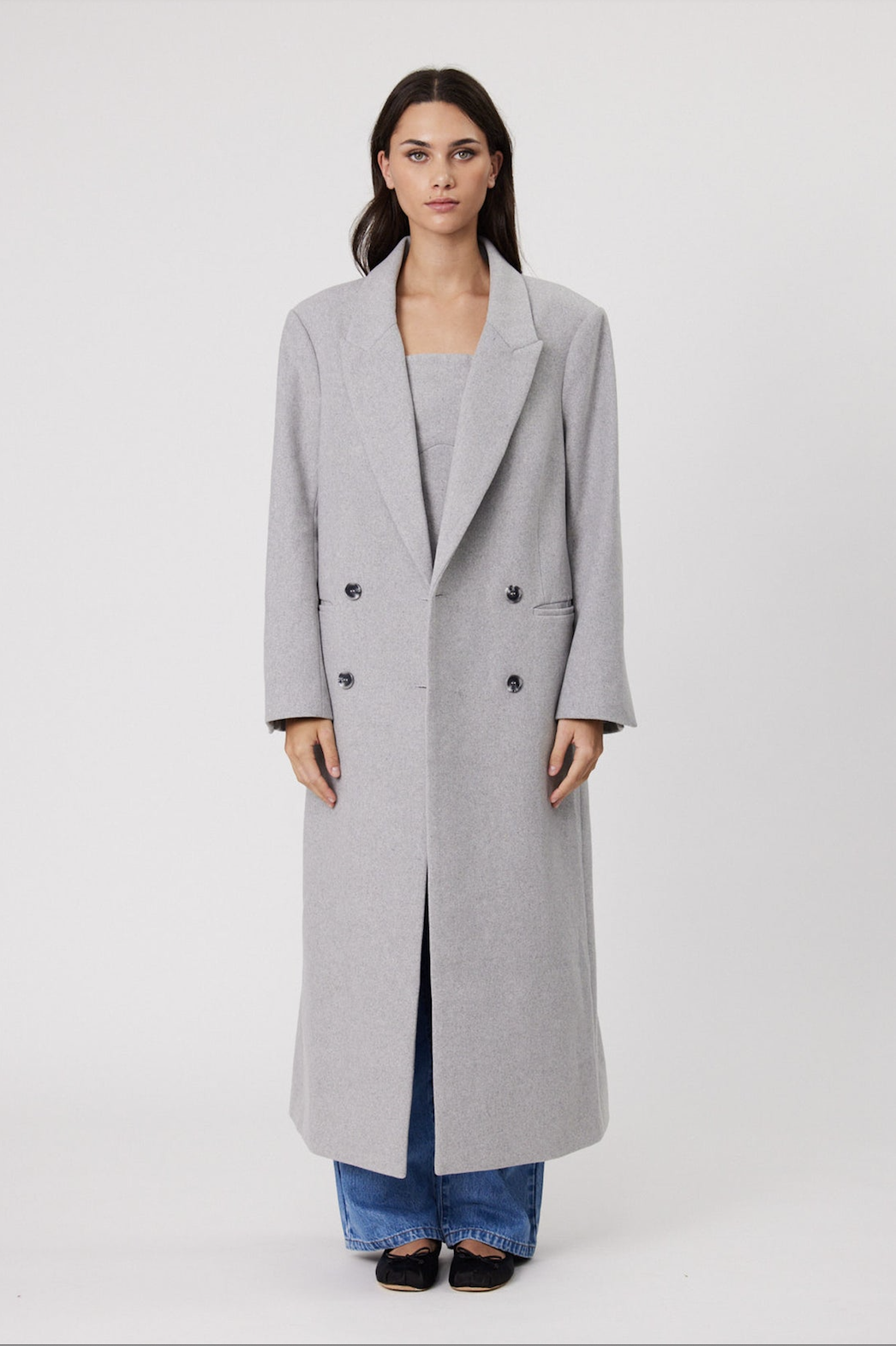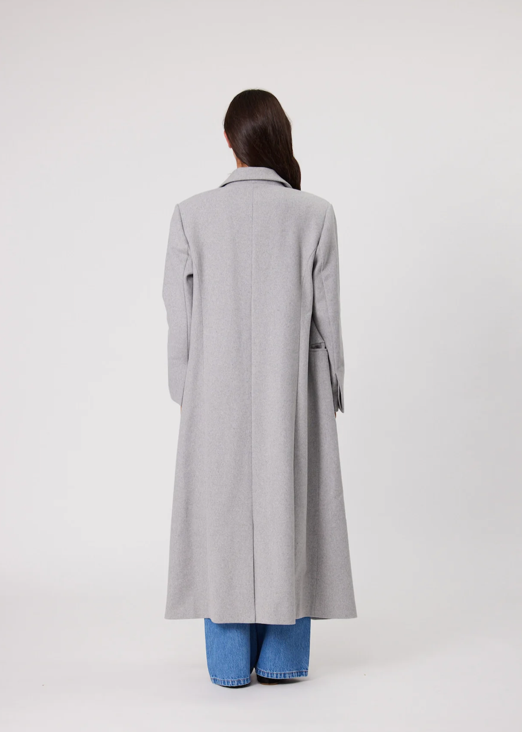 The Jackson coat is a double breasted longline coat that comes in a modern gray suiting. Featuring lapel collars, welt pockets at the waist and fastens with button closure. The perfect winter staple, designed to be worn for years to come.