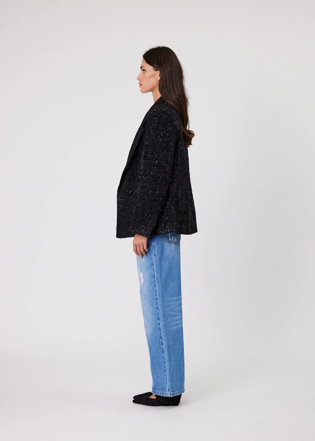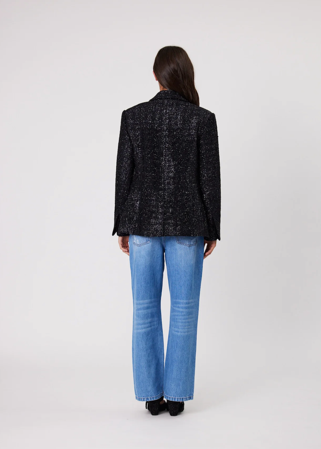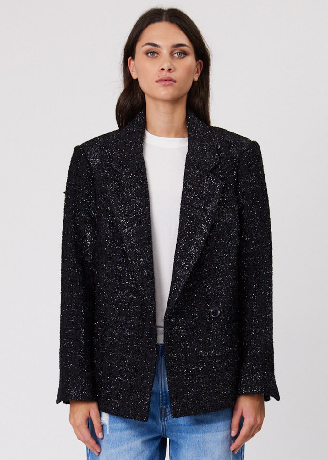 The Mali is a relaxed fit blazer. A must have this season, crafted from a textured sparkle fabric with front pockets and a button front closure.