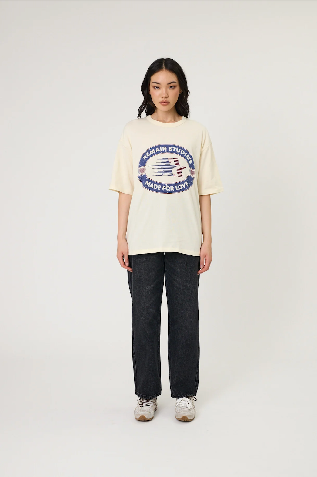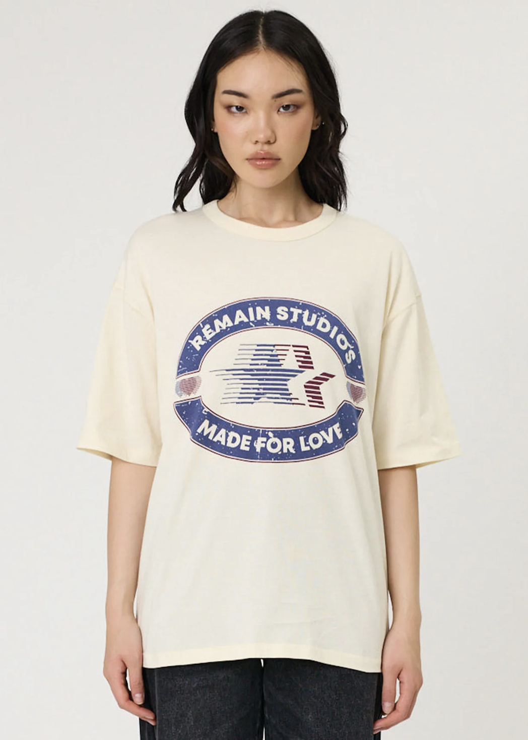 A staple tee for every wardrobe. The Starlet tee is a short sleeve tee with a boxy fit. Featuring a large custom chest print and exaggerated sleeves. Perfect with your favourite denim for an effortless everyday look.