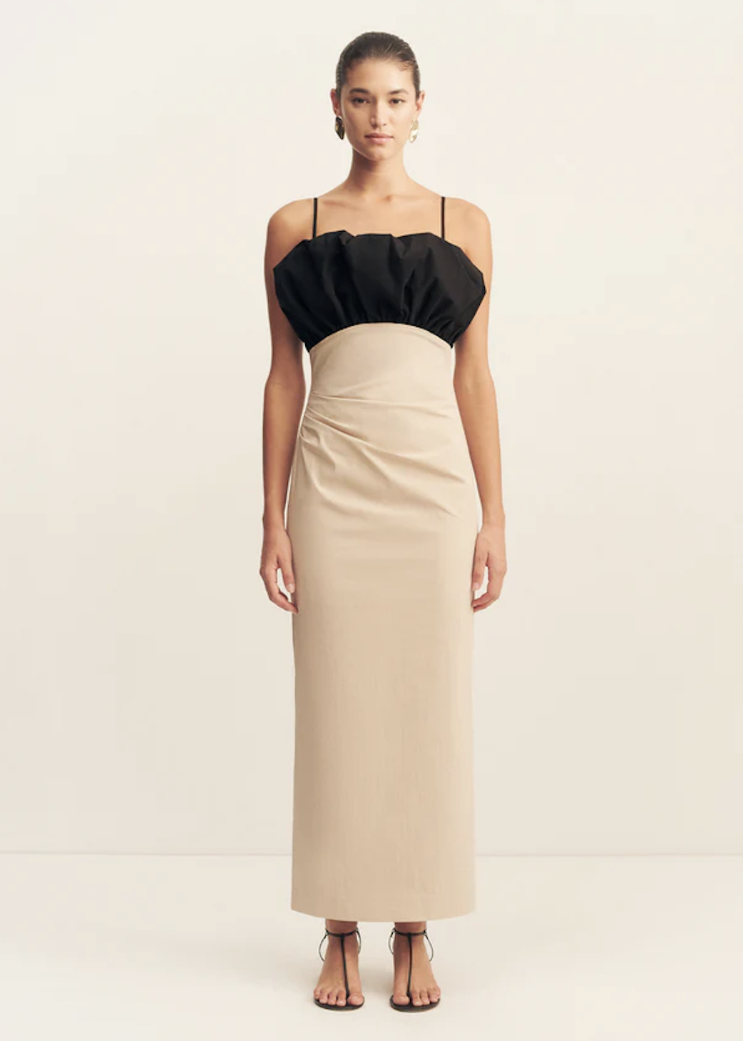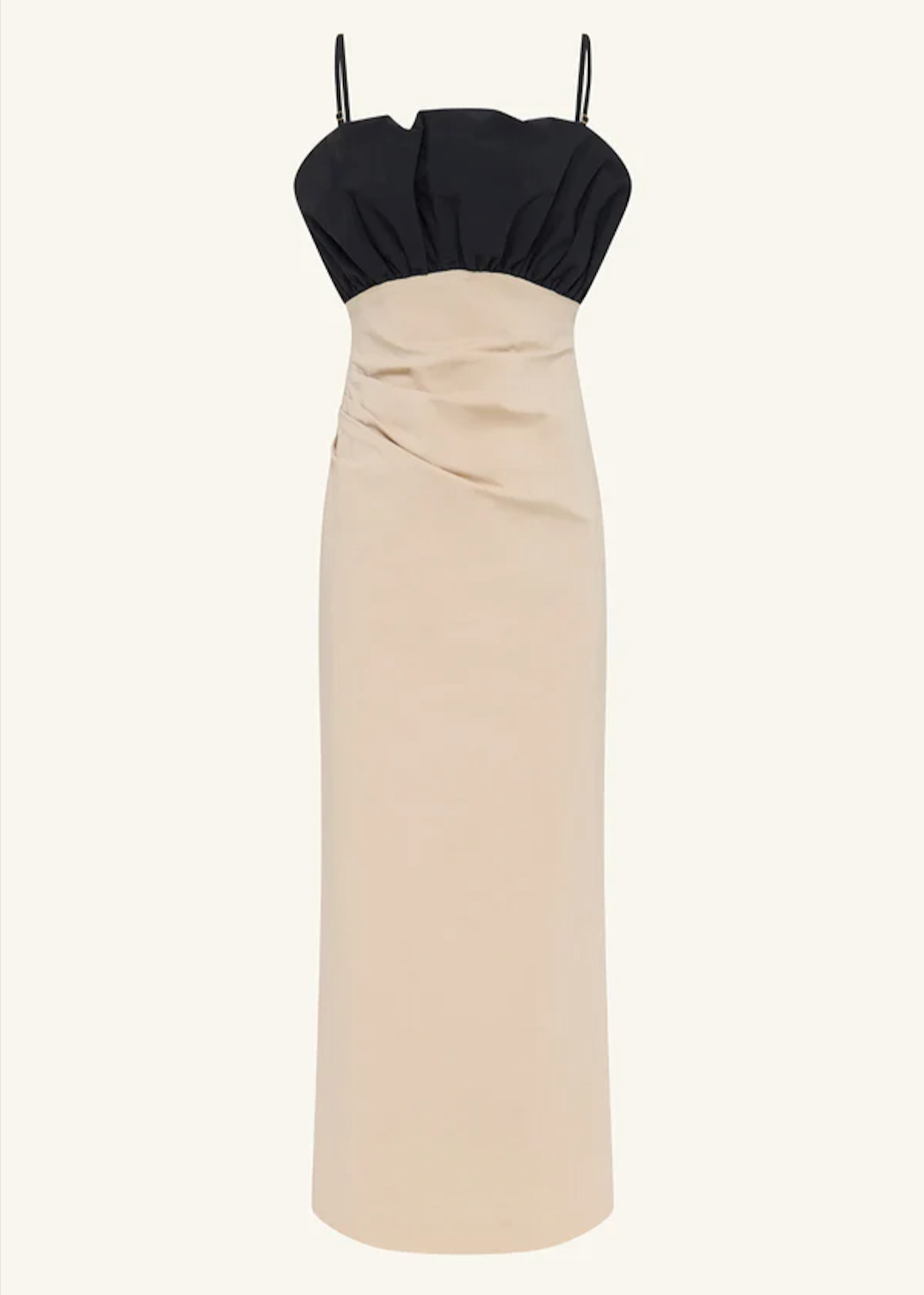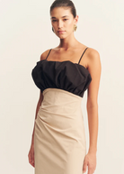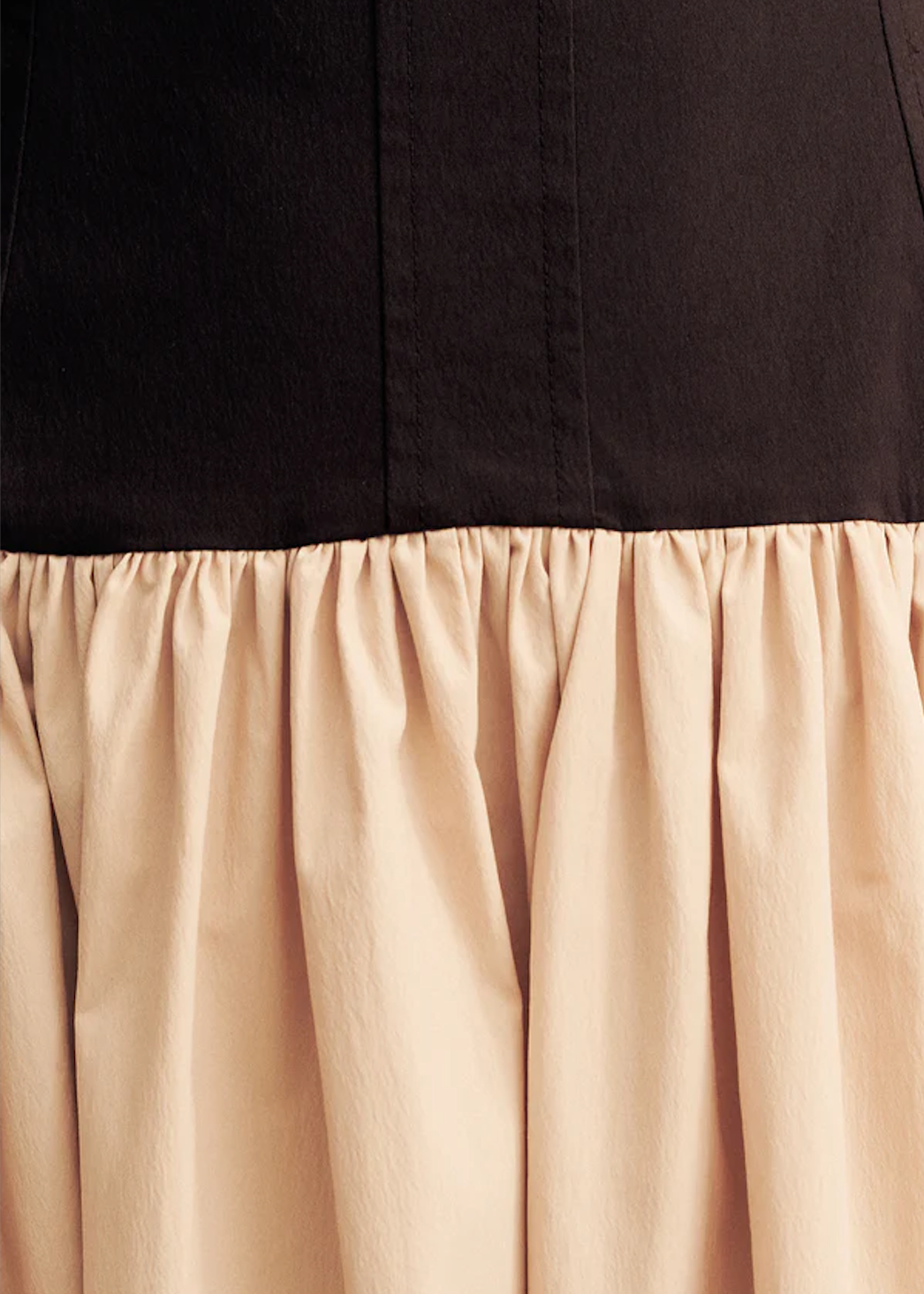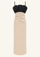 Bubble bodice midi dress in oat milk and black in a premium stretch cotton blend.