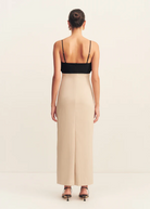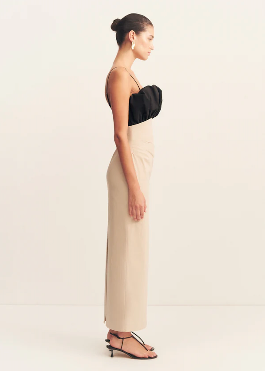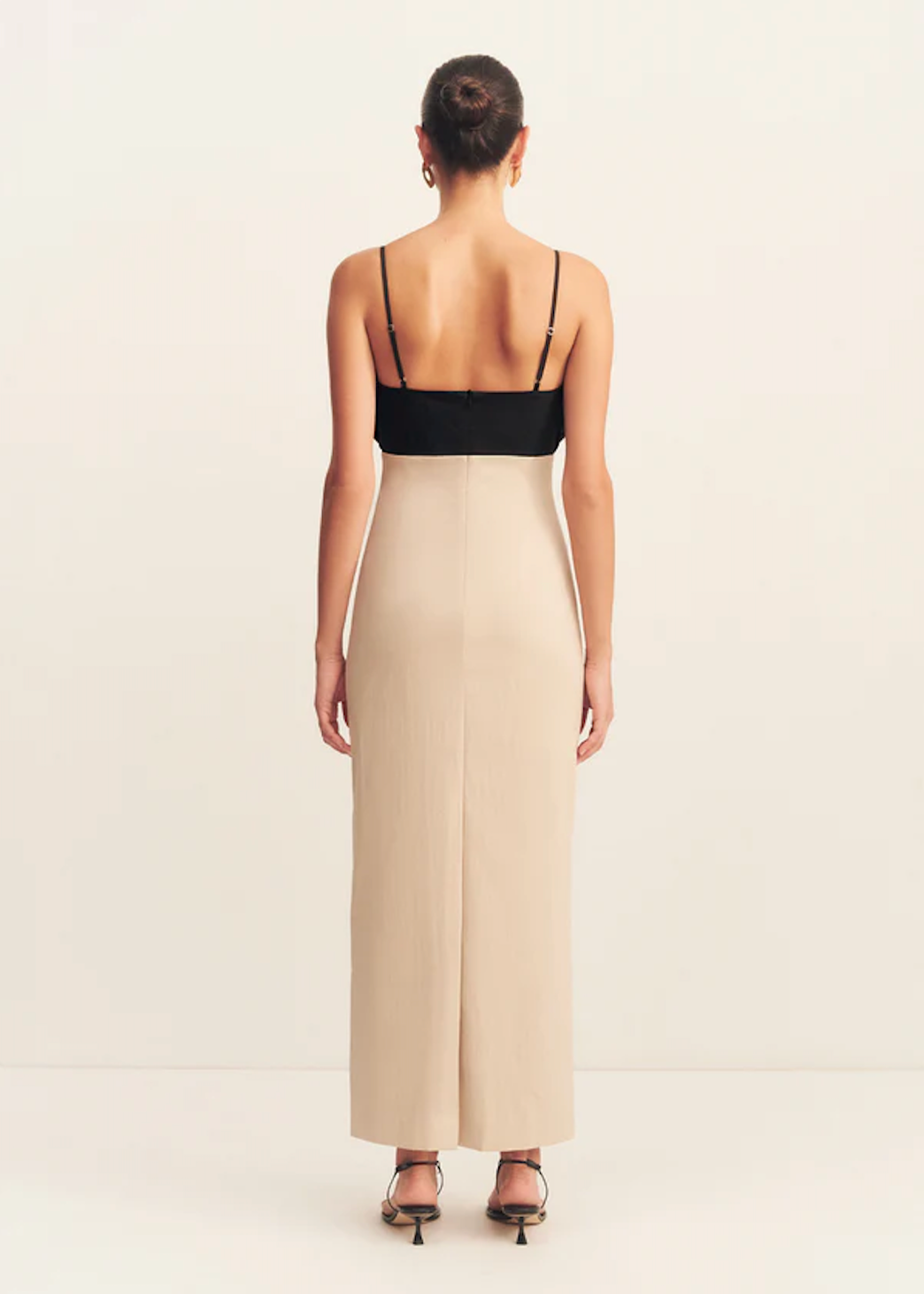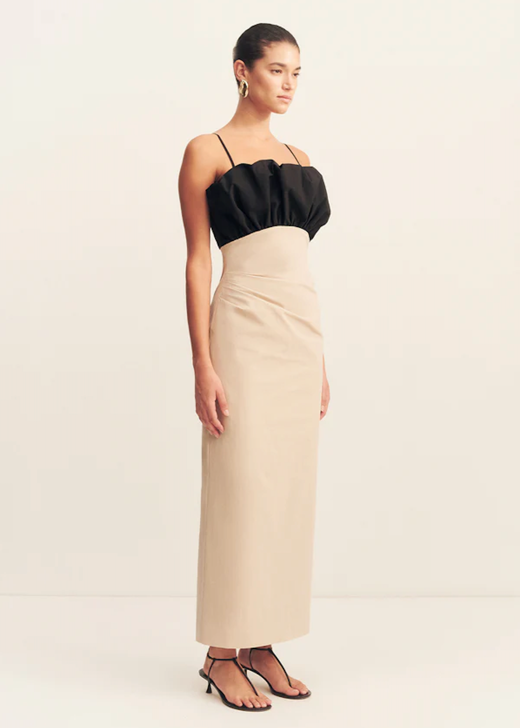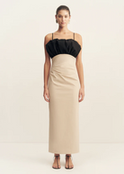 Bubble bodice midi dress in oat milk and black in a premium stretch cotton blend.