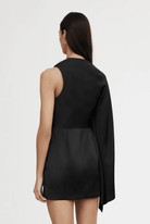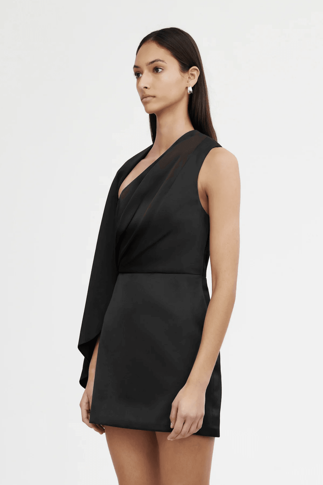 A new addition to the collection, the Annabel Mini Dress in Black is designed to be fitted throughout. Crafted from our soft touch satin fabrication, featuring a cape inspired sleeve, draping through the bodice and asymmetric neckline. A great option for bridesmaids