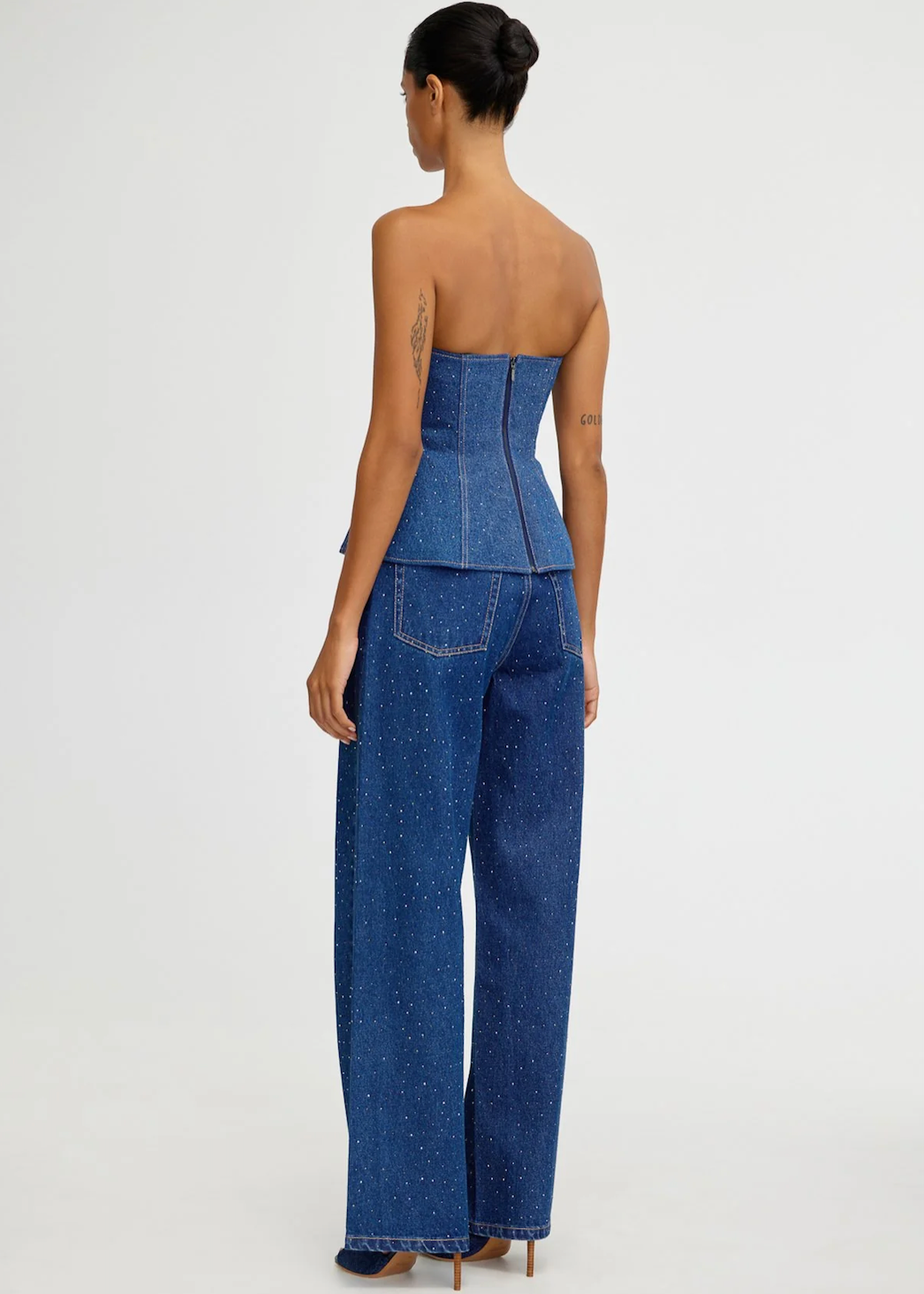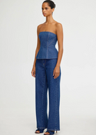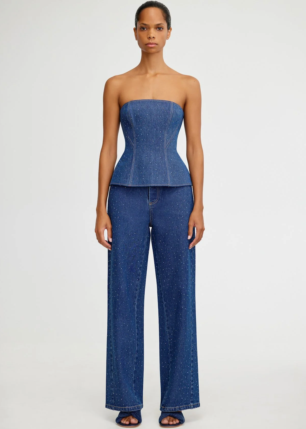 Crafted from woven diamante denim, the Juno Jean is your go-to for effortless sparkle. Unlined and featuring a straight leg silhouette, these jeans boast dimonte details throughout, a button fly, and gunmetal hardware. Their unique twist lies in side seams that twist to the front, making them staples that shimmer.