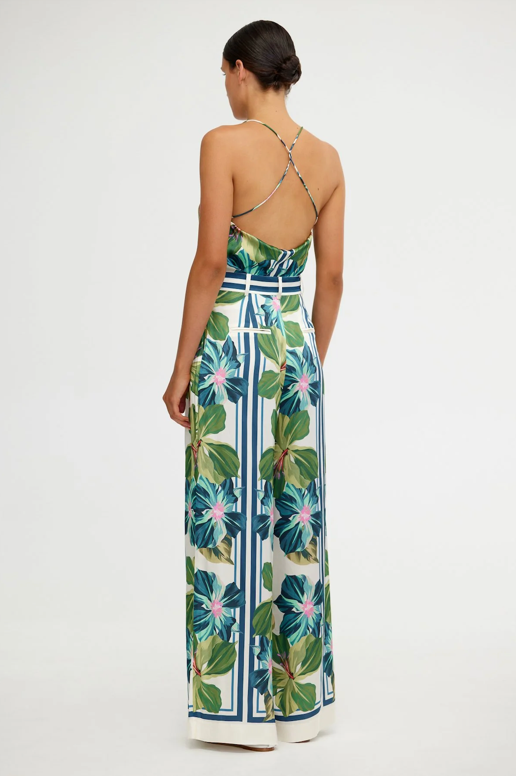 Ideal for casual elegance, the Mariah Top in lightweight, shiny satin features a vibrant placement print. This top showcases rouleau straps that cross over at the back, creating a subtle cowl effect. Designed for ease, it pulls on over the head making it perfect for relaxed summer days or evenings.