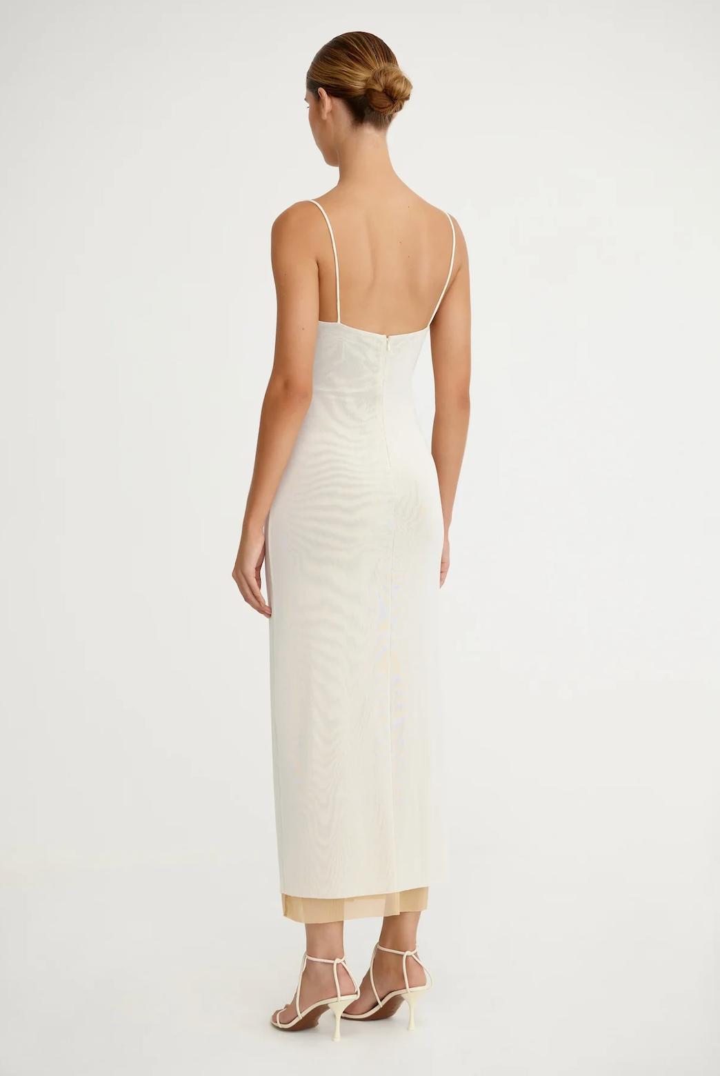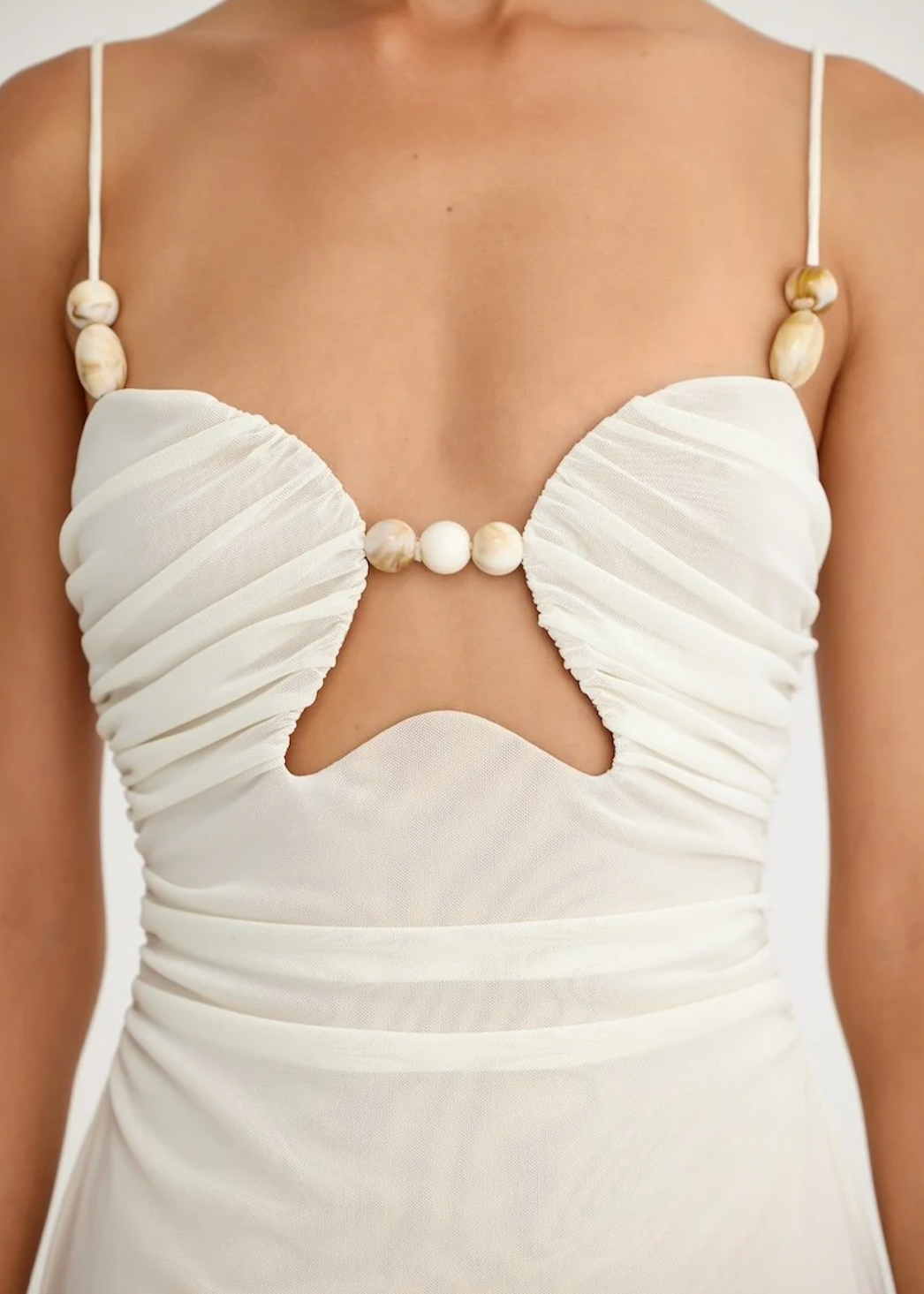 The Siobhan Midi Dress in Sand Splice is a chic choice for those warm summer nights. Featuring mesh with a fully lined mesh interior, this dress showcases a ruched bust with underwire and a striking cut-out. Bead detailing on the straps adds a hint of elegance, ideal for afternoon cocktails or summer celebrations.